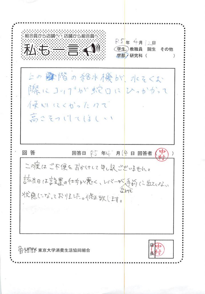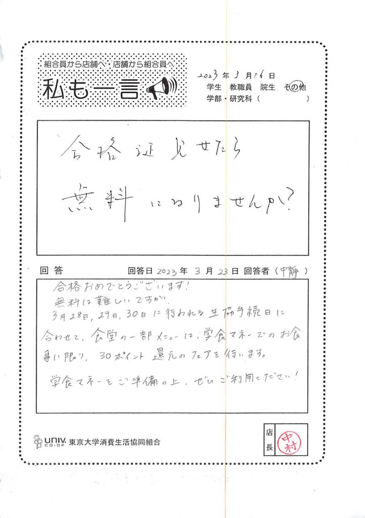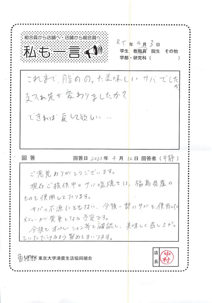 「レトルト感が強い」といういただきましたご意見は、大学生協共通のメニュー担当に伝えさせていただきます。
