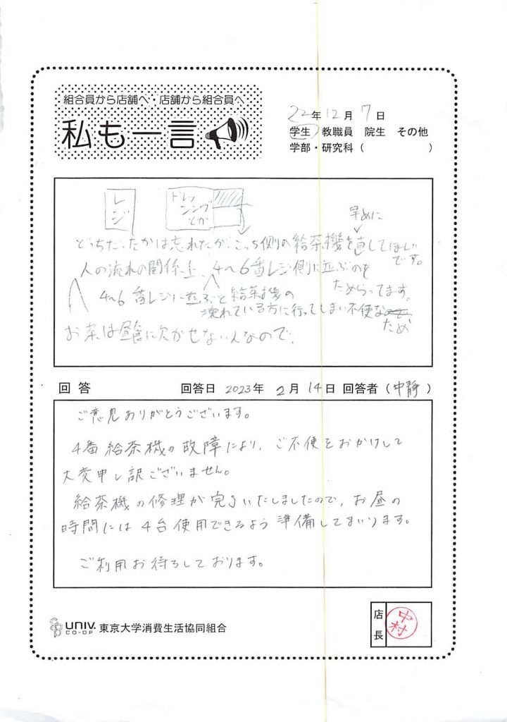 こっち側の給茶機を早めに直して・・・