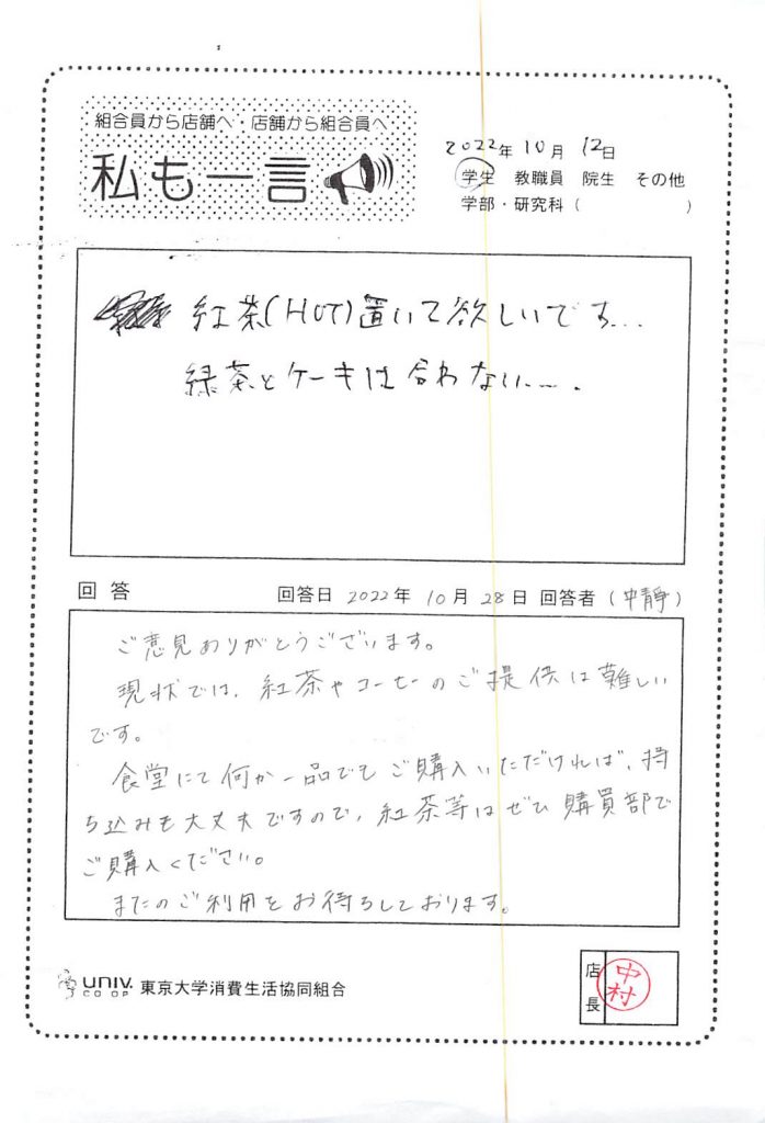 紅茶(HOT)置いて欲しい・・・