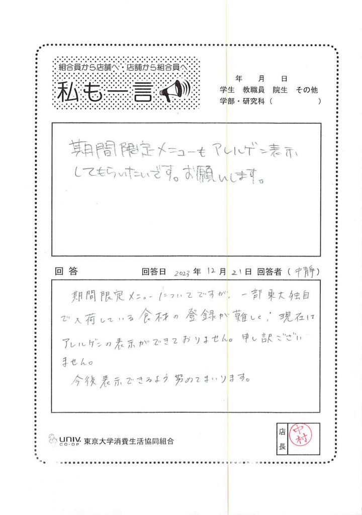 期間限定メニューもアレルゲン表示を・・・