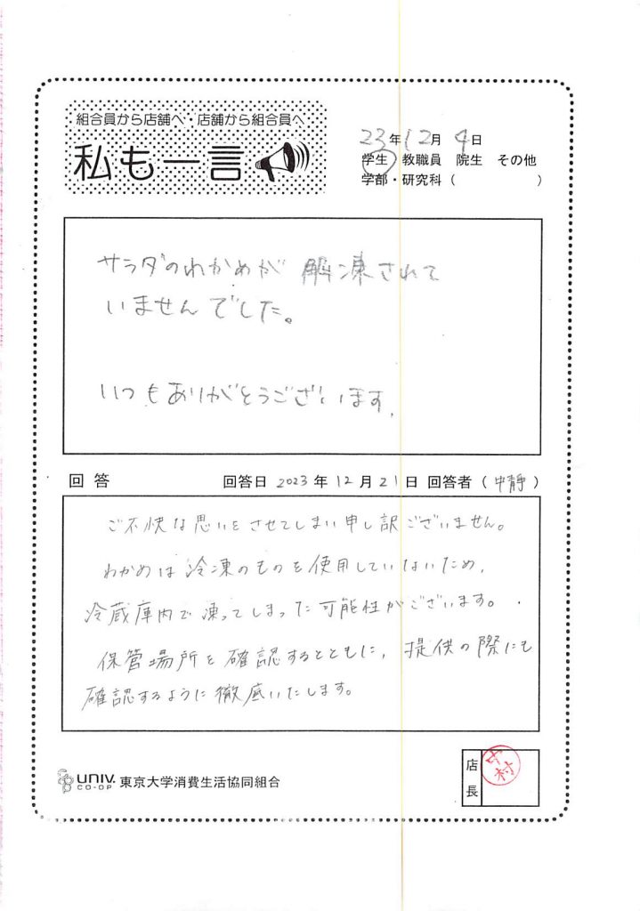 サラダのわかめが解凍されていませ・・・