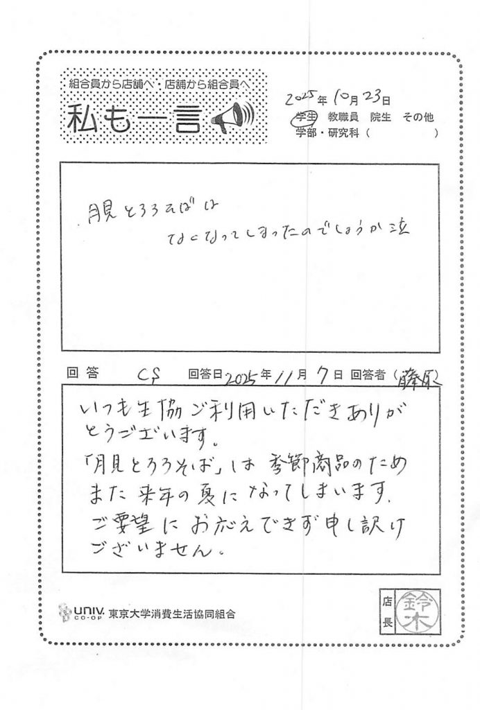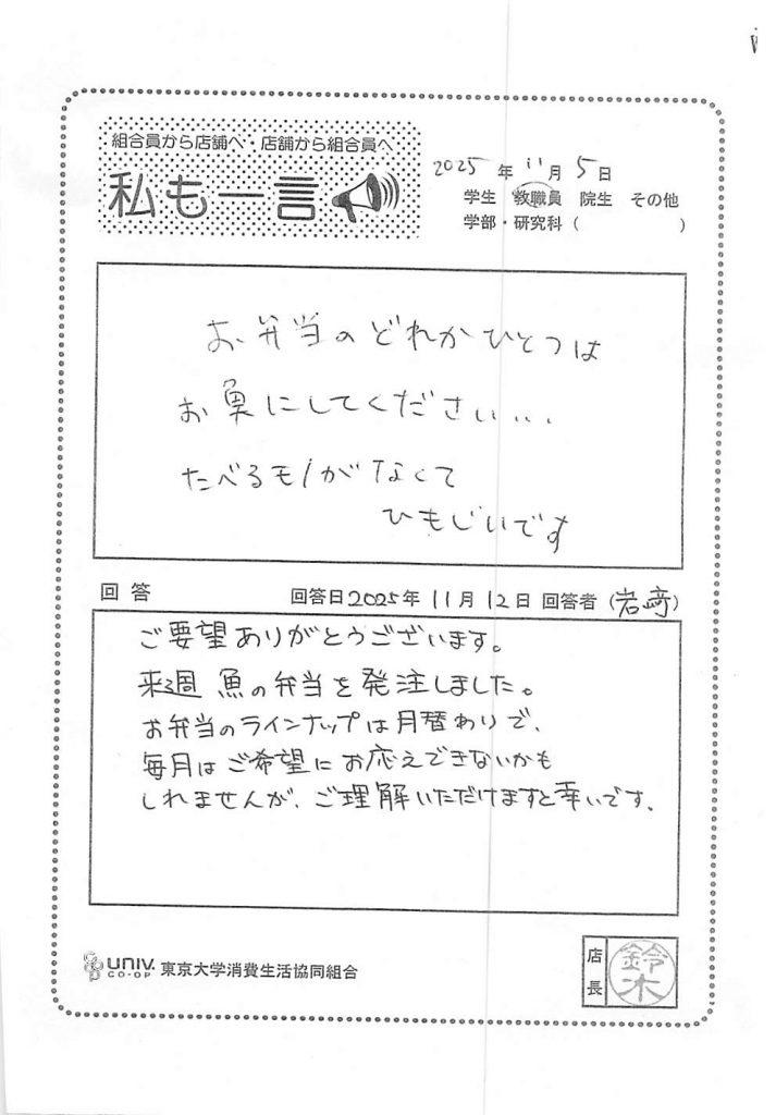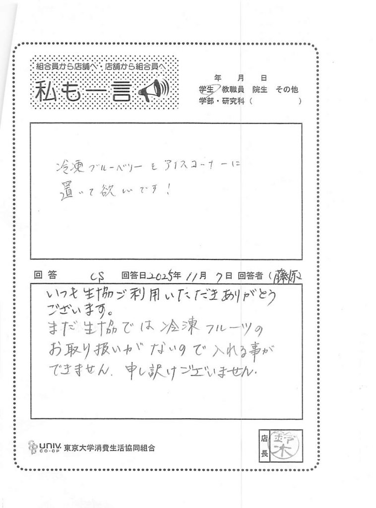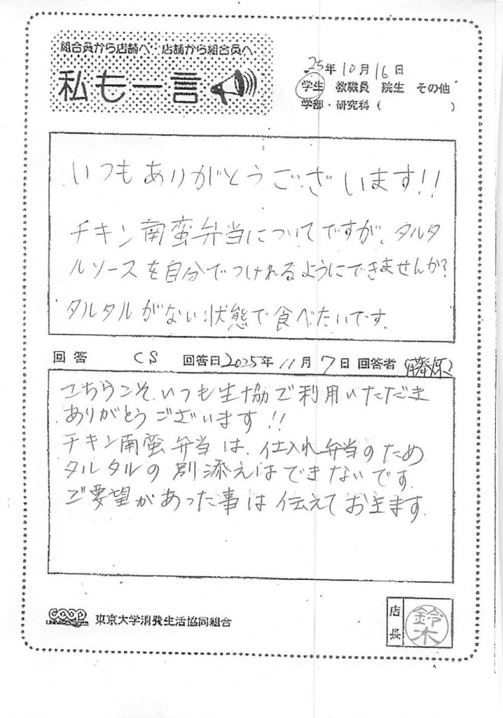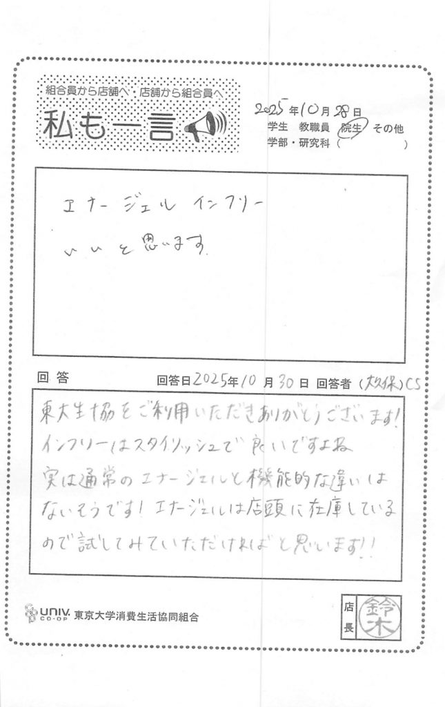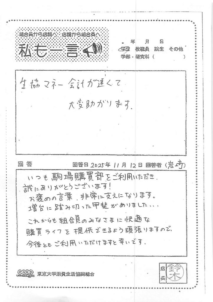 引き続き東大生協のご利用をお願いすると共に、今後もお気づきの点やご意見、ご要望等ございましたら、お気軽にお寄せいただけますと幸いです。