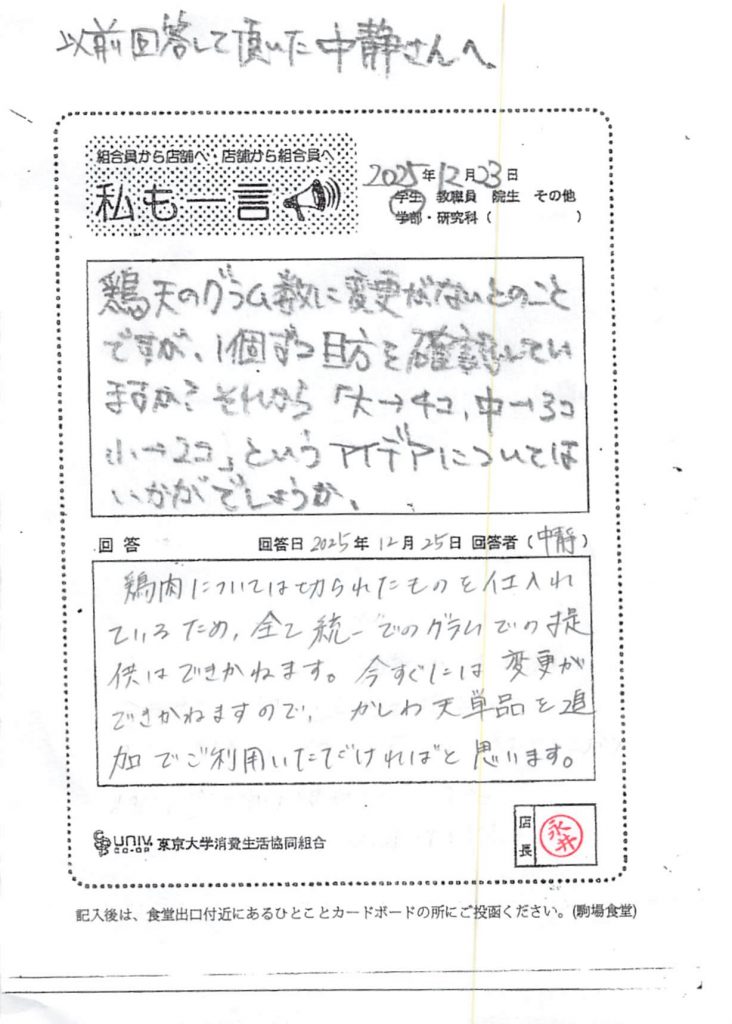 鶏天のグラム数に変更がないとのことですが・・・