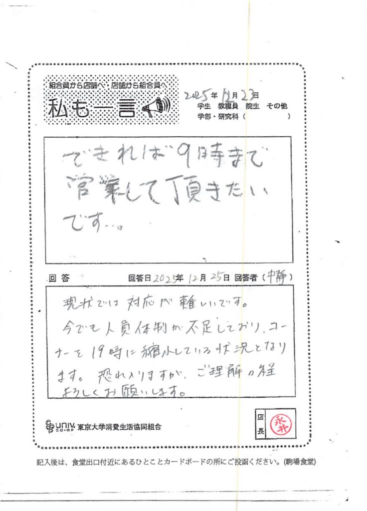 できれば9時まで営業して・・・