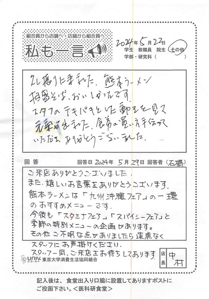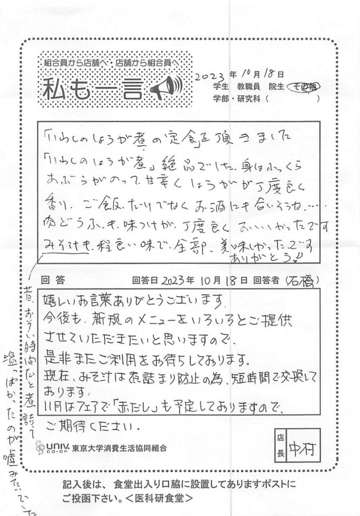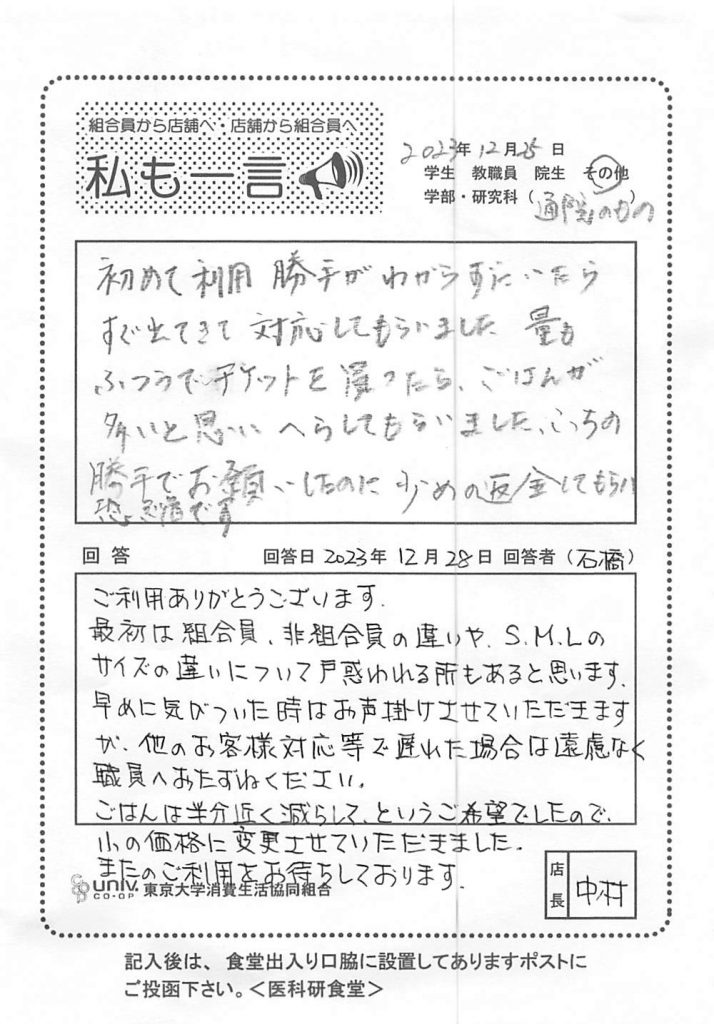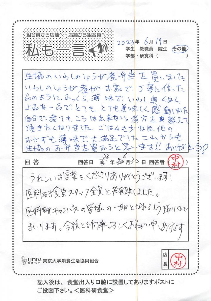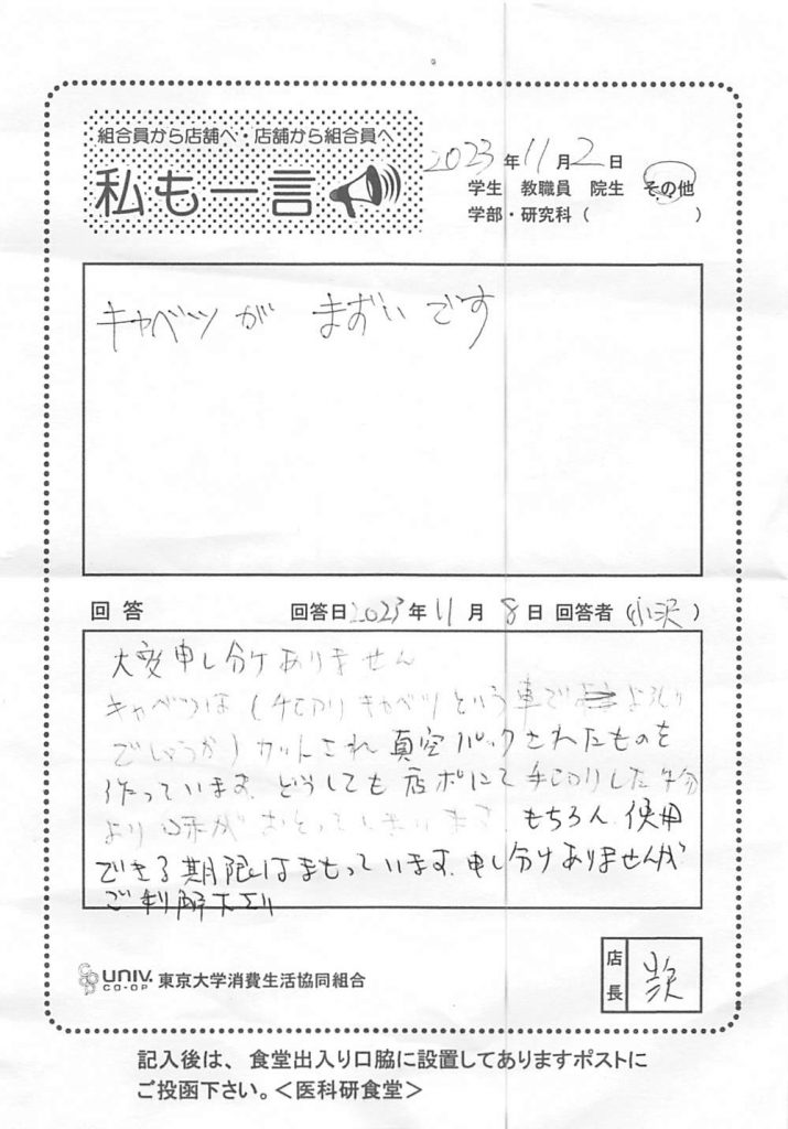 医科研食堂のメニューをオンラインで見れるのはありがたいのですが、画質が悪すぎて読めません。改善お願いいたします。