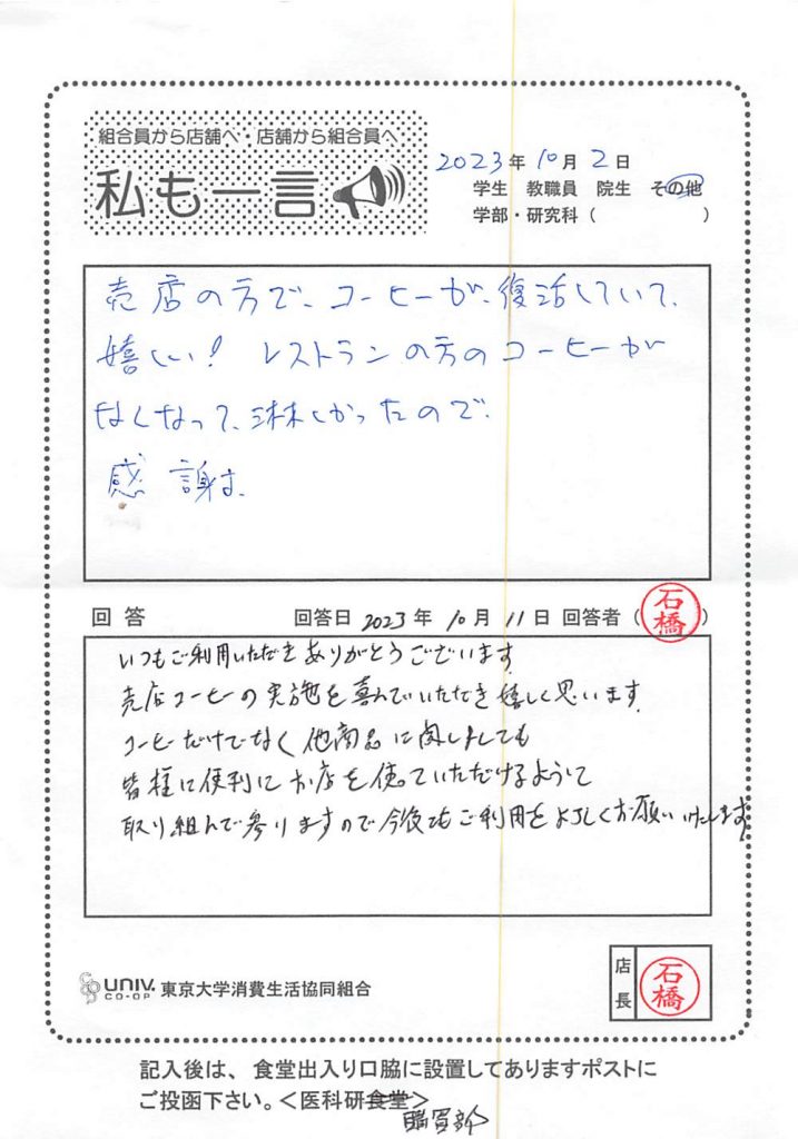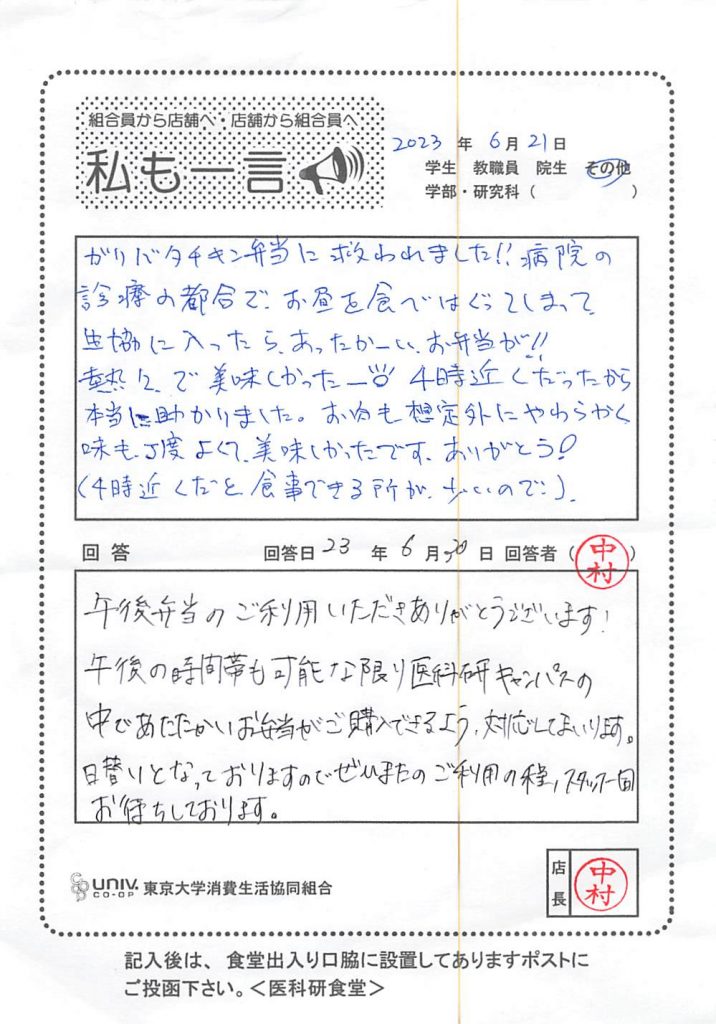カテゴリで検索いただく場合は「食堂・購買複合店」キャンパスで検索いただく場合は「医科研」にて検索できるようタグを統一しました。