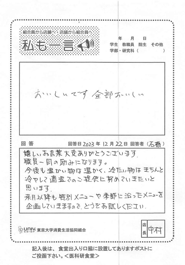 WEB上の医科研食堂メニューが解像度が低く読み取りずらいので拡大できる方式で貼り付けてほしいです