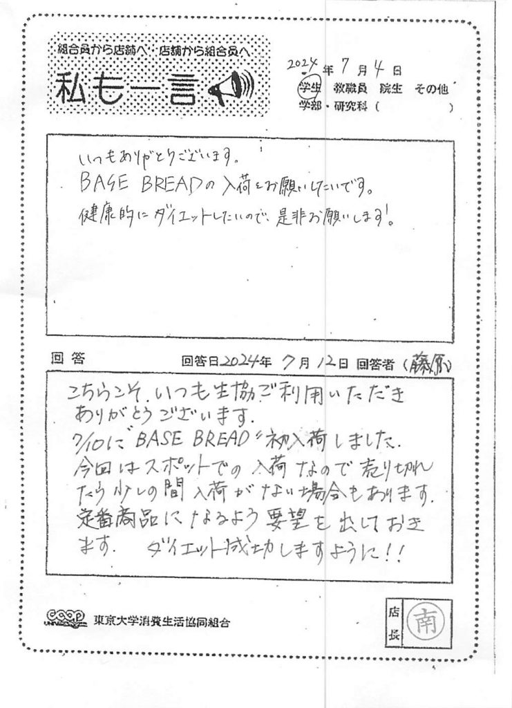 BASE BREADの入荷をお願い・・・