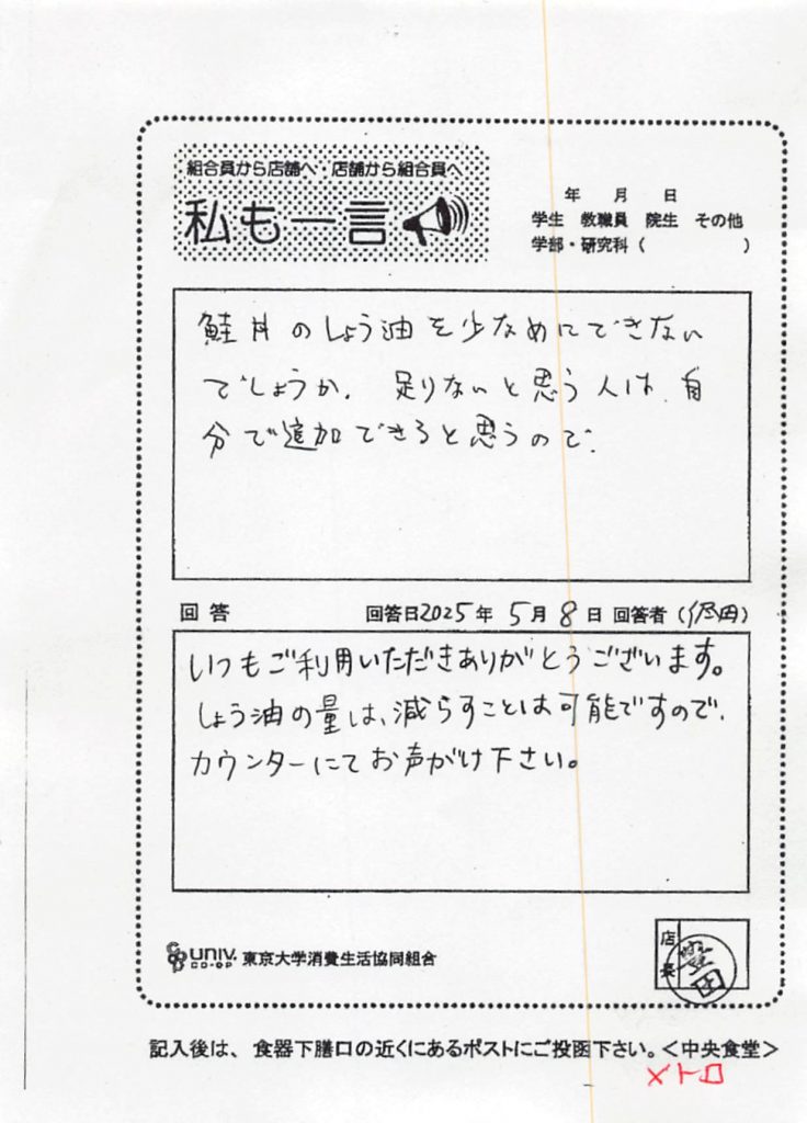 鮭丼のしょう油を少なめにできないでしょうか・・・