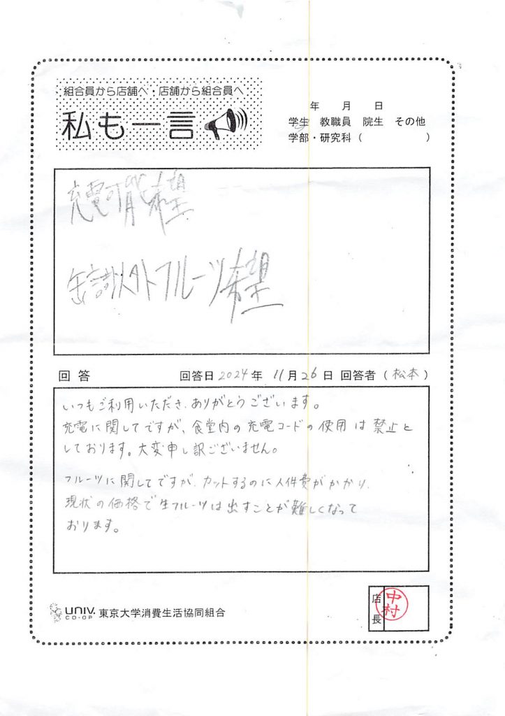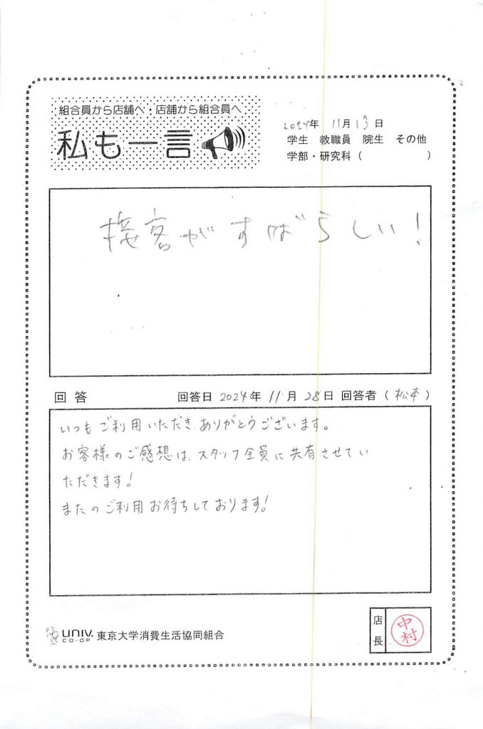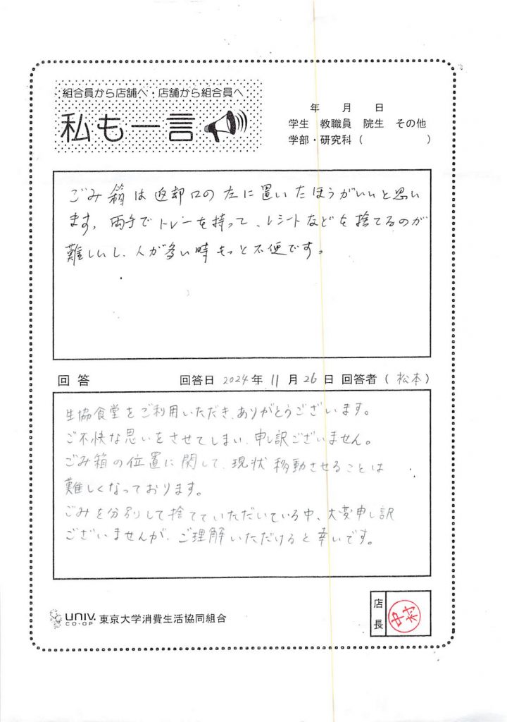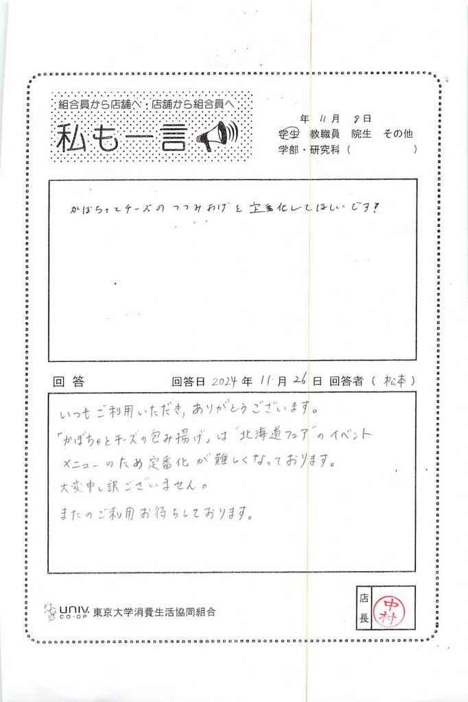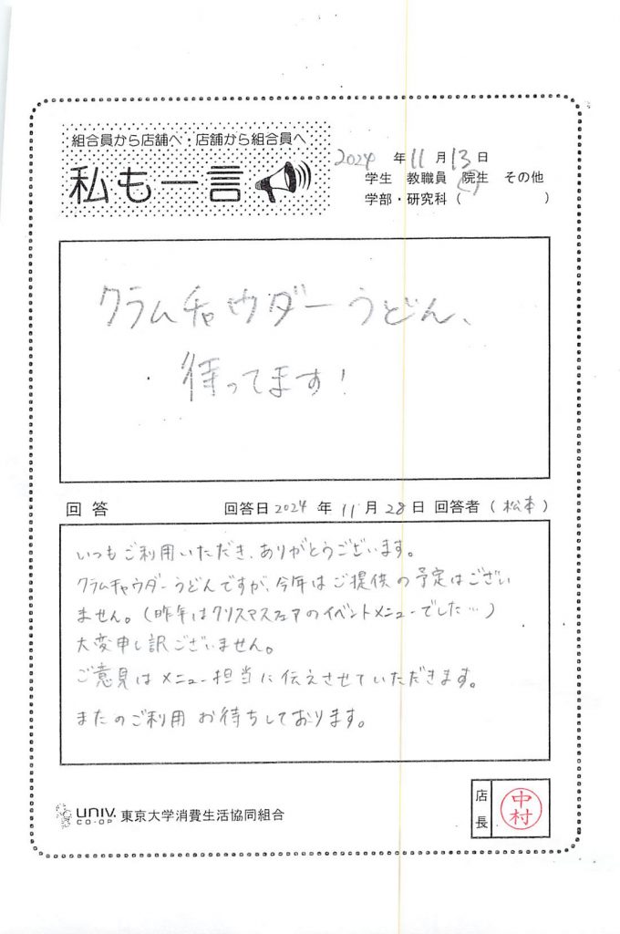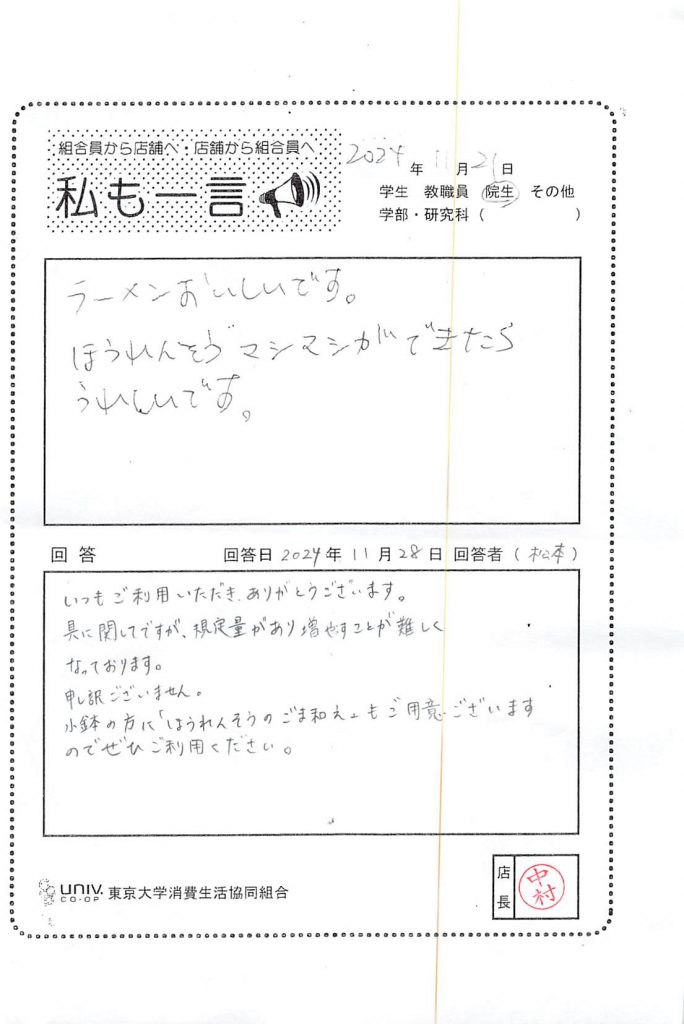 鶏肉に赤みがあったとのこと、ご不快な思いをさせてしまい申し訳ございませんでした。当メニューに使用の「スチームカットチキン」につきまして、確認したところ、加熱済の商品を中央食堂での調理時にも加熱して仕上げているメニューでございます。また、食材担当にも確認したところ、鶏肉の性質上、加熱がされていても赤く発色する現象として「ピンキング」というものがあり、今回の場合はその可能性が考えられます。以下、ピンキングについてです。食肉にはミオグロビンといわれる色素タンパク質が含まれており、一般的には加熱することで変性し酸化状態となり褐色に変化しますが、加熱後も変性しない耐熱性のミオグロビンが含まれることがございます。耐熱性のミオグロビンは鉄の酸化防止作用があり、鉄の還元状態が維持されるため、肉が赤色を呈する場合がございます。また原料の状態によっても赤みが強く残存する場合があり、①血管に近い血合いの部分が混ざったことにより加熱後にも赤い色調が残存(固定化)した②屠畜後の血抜きが不十分で原料肉全体に血が残存した③生体への何らかのストレスにより一部の血量が増加し最終製品に影響が出た等、原料由来の要因が推測されます。製造時70度以上1分スチーム加熱されておりますのと、当中央食堂でも加湿モード220度10分の加熱をしておりますので、健康上のリスクは限りなく低いものと考えられます。また、今後当食堂メニューにつきましてお気づきの事があった際はその場でスタッフに声をかけていただけますと幸いです。改めてこの度はご不快な思いをさせてしまい申し訳ございませんでした。