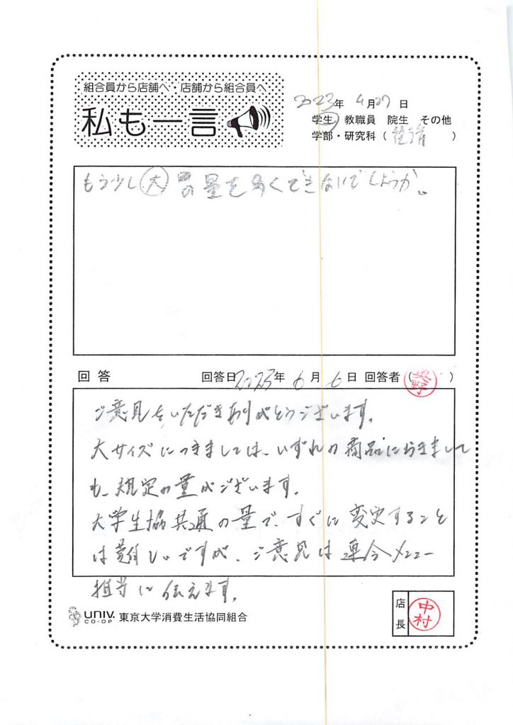 もう少し大の量を多くできないでしょうか・・・