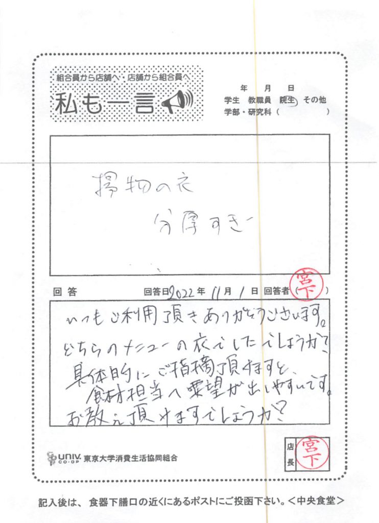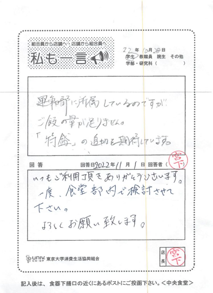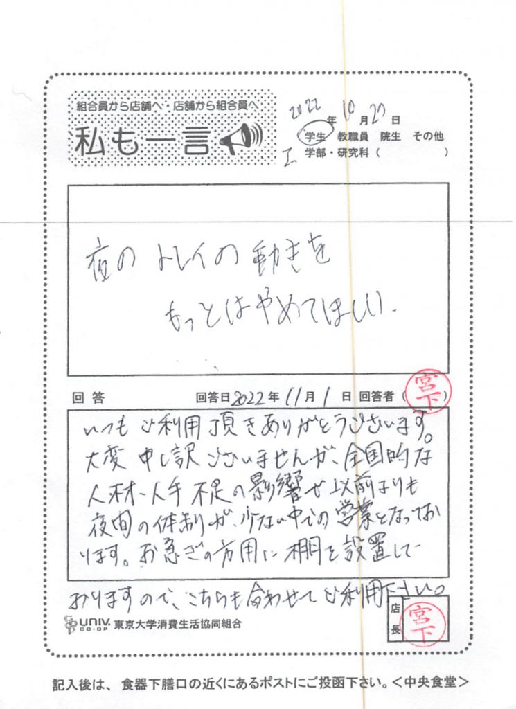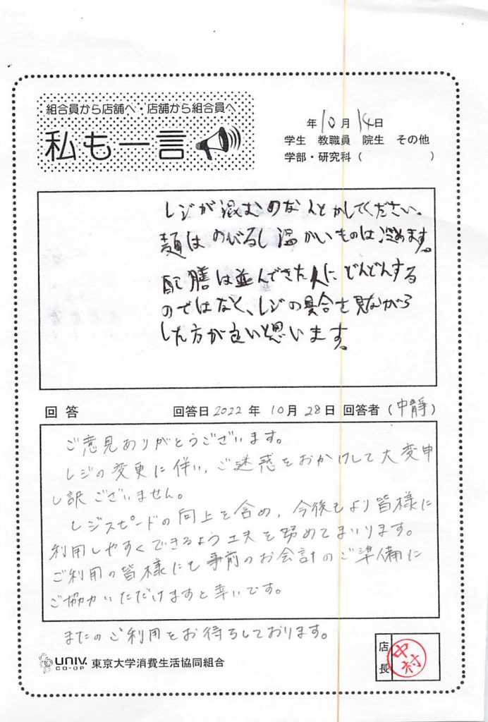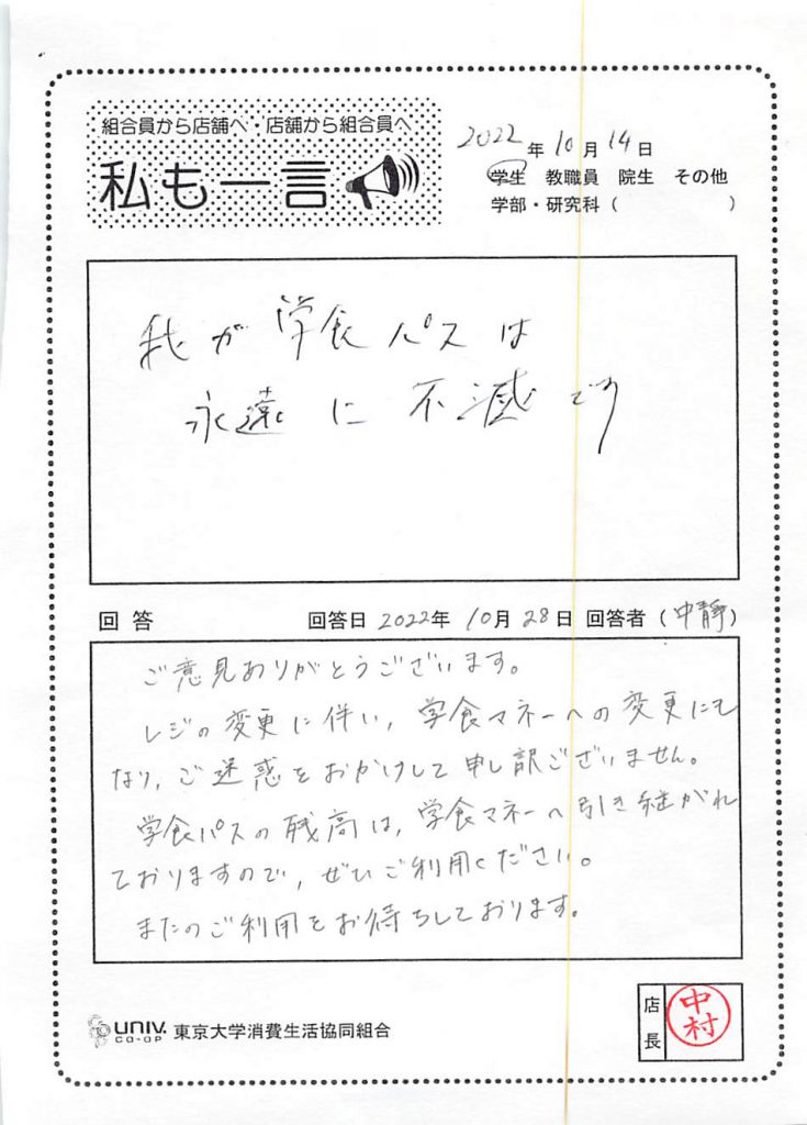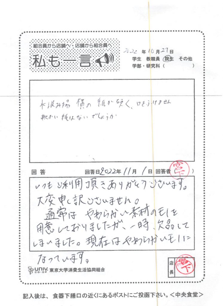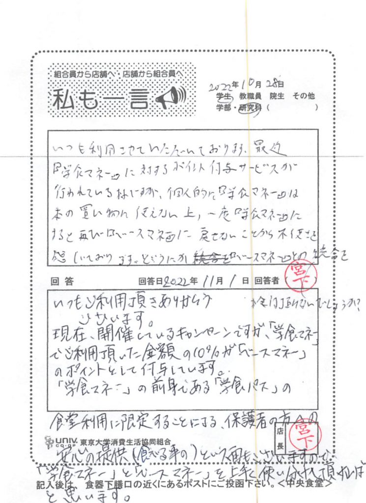 また、こちらの周知が十分でなかったため、いただきましたご意見を受け止め食堂出入口に学食ドットコープご案内のポスターを掲示させていただきます。