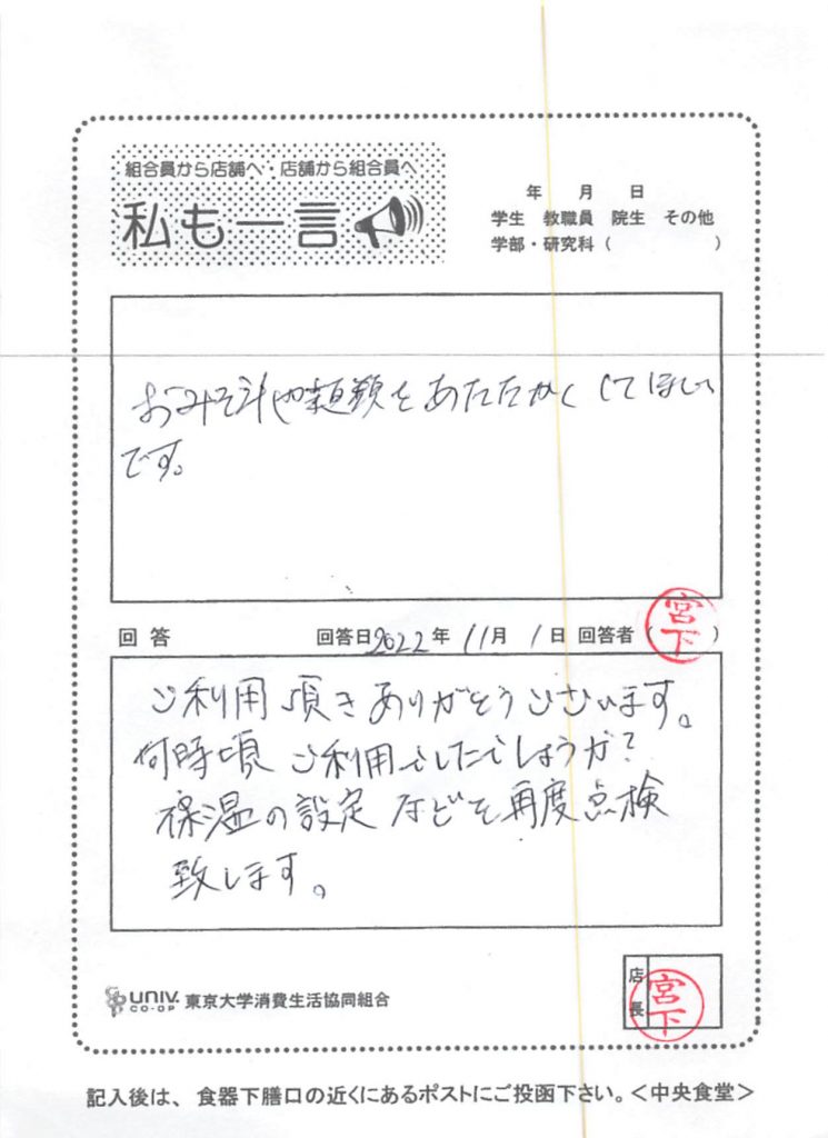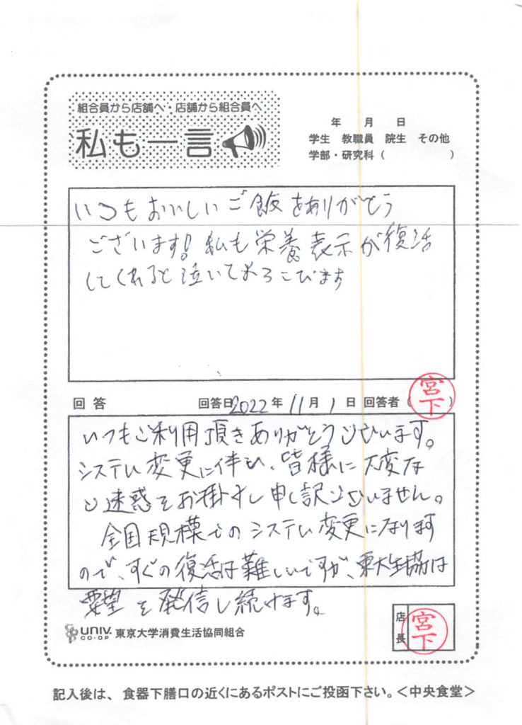 栄養表示へのアクセスを改善してほしいです。各メニューの栄養表示が入口と受け取り口に張り出されているだけで、ネット上にも見当たらないのでわざわざ写真を撮らなくてはなりません。アプリで利用履歴から見ることもできますがとても見にくい上面倒です。各メニューの栄養表示をホームページやTwitterなどで公開していただけないでしょうか?