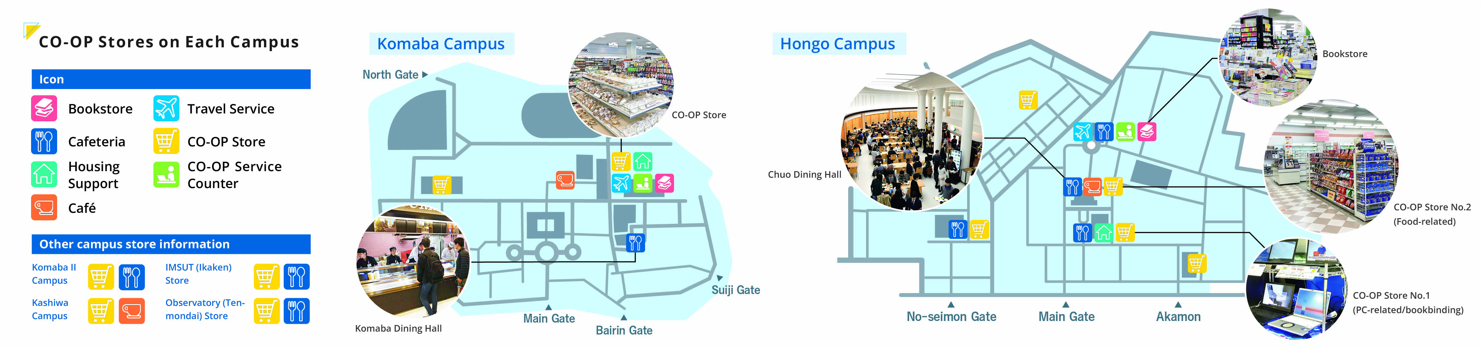 東大生協は、東大の各キャンパスで、購買・書籍・食堂・トラベル・住まいなどの事業を通じて組合員の生活をサポートしています。
