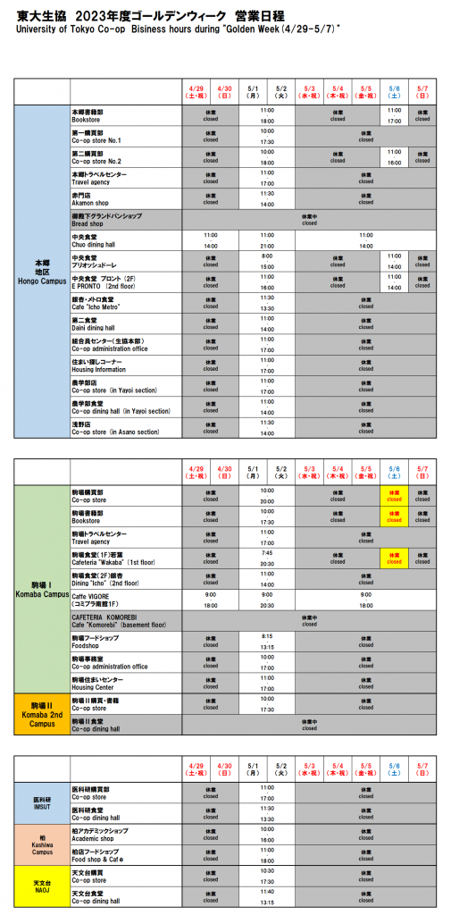 お知らせ 20234/25 全体 2023年ゴールデンウィーク期間の営業について ゴールデンウィーク期間の各店舗の営業日程は下記の通りとなります。 営業日程・時間が変更になっている店舗(黄色部分)がありますが、ご理解のほどお願いいたします。 2023年ゴールデンウィーク期間営業日程.pdf Tweet お知らせ 一覧へ