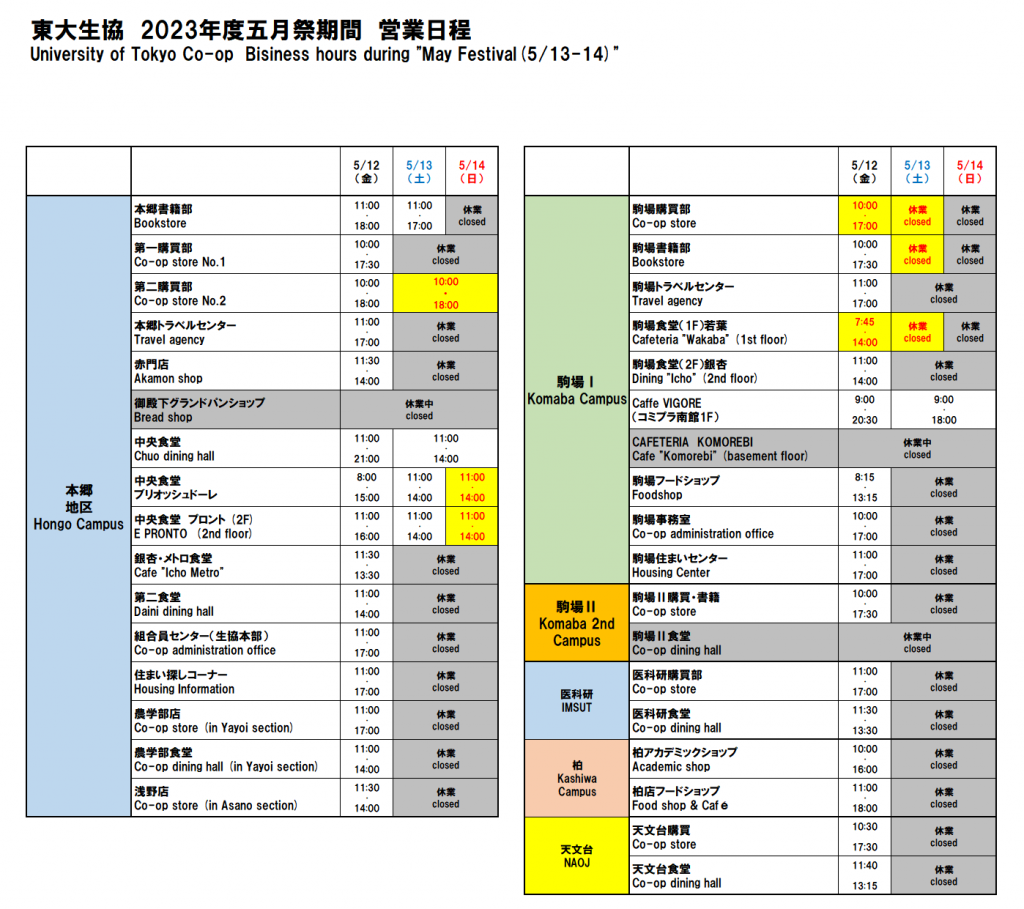 お知らせ 20234/25 全体 2023年五月祭期間の営業について 五月祭期間中(5月12日(金)~14日(日))の営業時間は下記の通りとさせていただきま。黄色部分が通常営業時間と異なる部分です。 2023年五月祭期間営業日程.pdf Tweet お知らせ 一覧へ