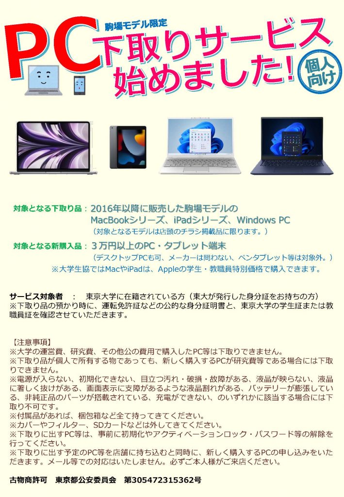 2016年以降に販売した駒場モデルのPCを対象に下取りを行います。新しくPCを購入する際、下取り金額を新しいPCの購入金額から値引きいたします。詳細は店頭のチラシをご確認ください。