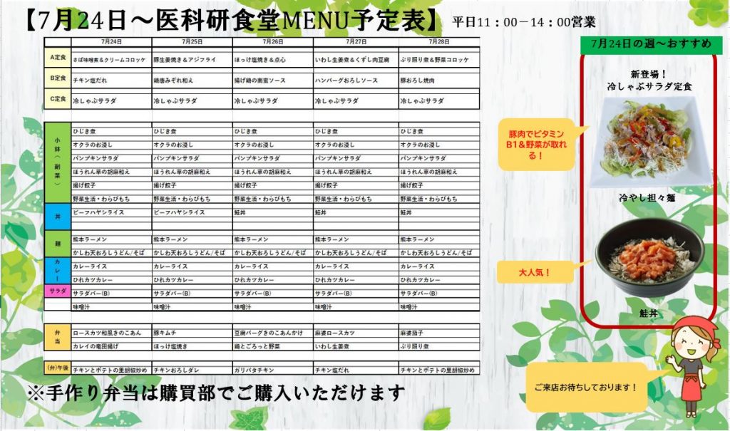 食堂・購買 複合店 20237/21 医科研 医科研食堂7/24~8/4メニュー予定 いつも医科研食堂をご利用いただきましてありがとうございます。 7月24日~週のおすすめは新登場「冷しゃぶサラダ定食」(週替) 7月31日~週のおすすめは冷やし担々麺です! ご利用の程お待ちしております。 Tweet お知らせ 一覧へ