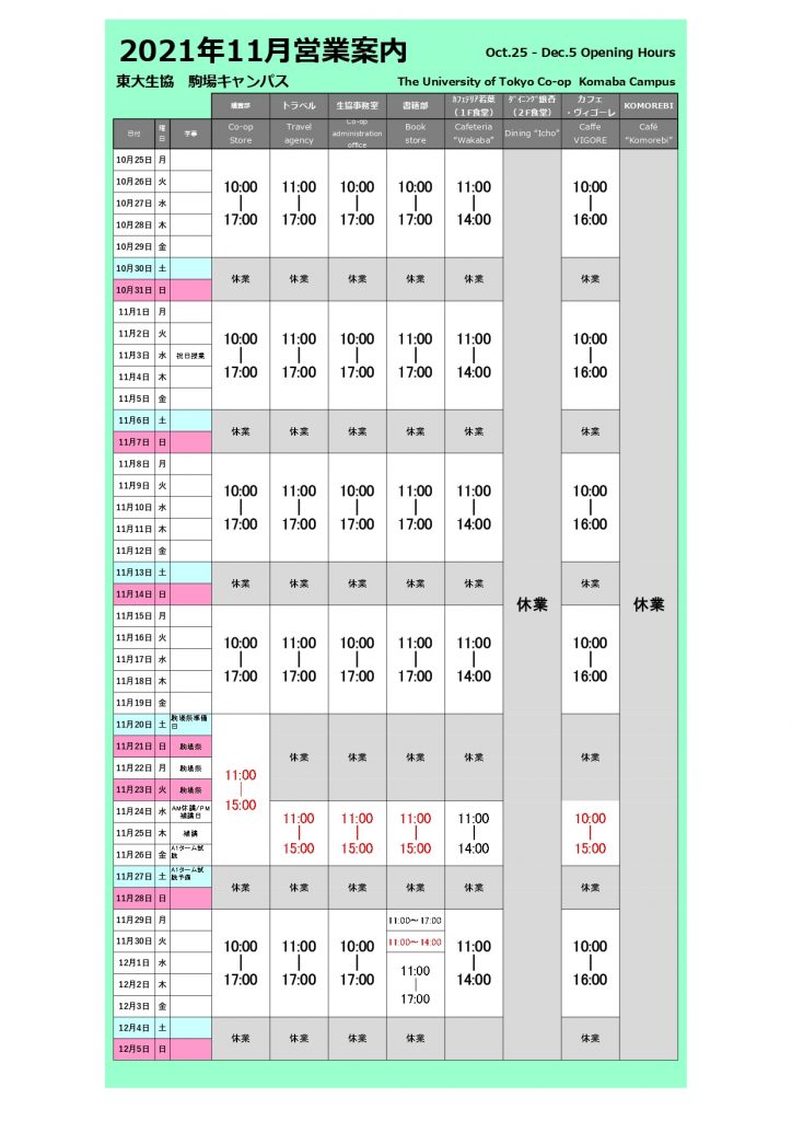 お知らせ 202110/25 全体 駒場祭期間中の営業時間 ・11月3日祝日(水)は、授業日のため、通常営業です。 ・駒場書籍部の11月30日(火)は、イベントのため、14:00で閉店します。 駒場祭期間中の営業時間PDF Tweet お知らせ 一覧へ