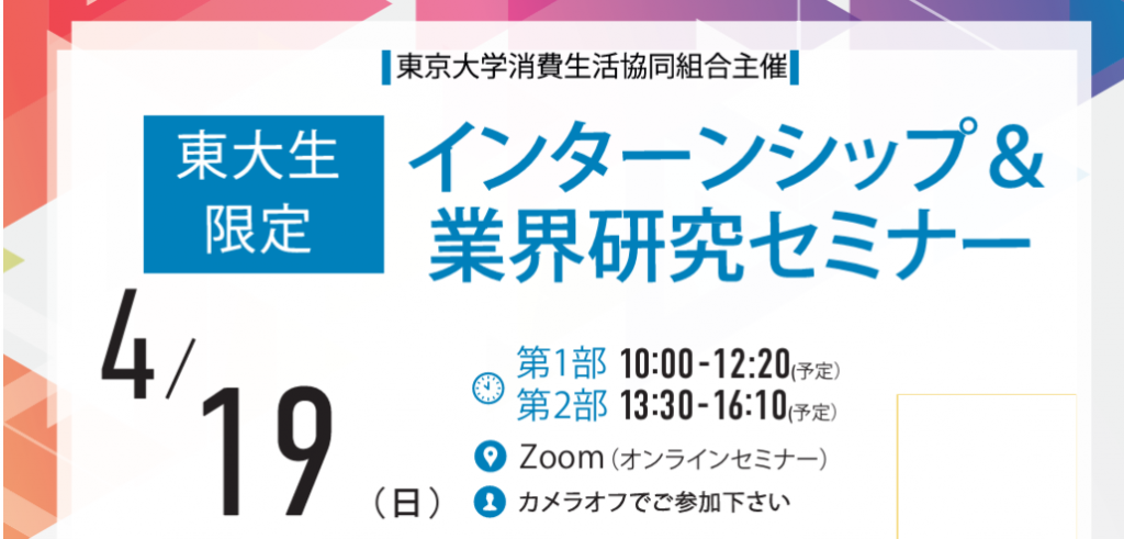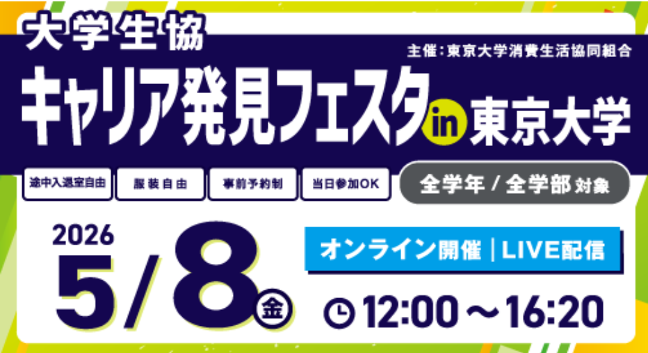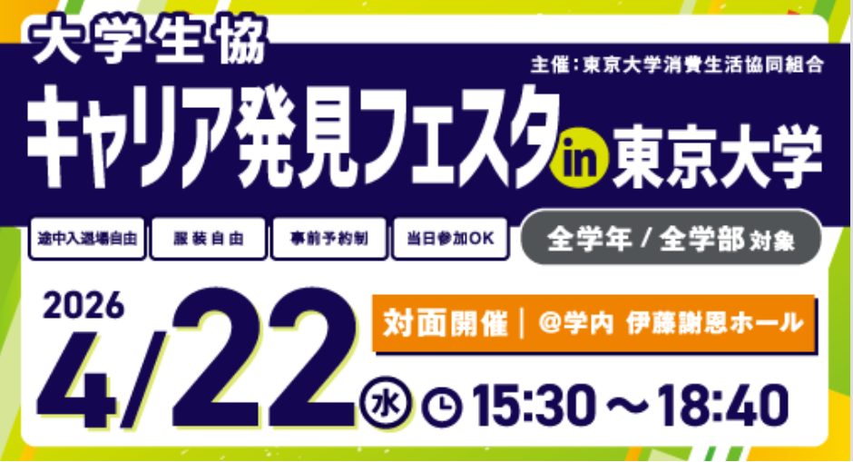 東大生協主催イベント 東大生限定!東大の全学部・全学年対象です 1「東大生のためのサマーインターンシップ&業界研究セミナー」 日時:4/16(木)15:30-18:45 形式/場所:対面/本郷キャンパス 伊藤国際学術センター 運営協力:株式会社サイシード 詳細・申込ページ:近日公開 2「東大生限定 インターンシップ&業界研究セミナー」 日時:4/19(日)第1部10:00-12:20、第2部13:30-16:10 形式:オンライン(Zoom) 運営協力:文化放送キャリアパートナーズ 詳細・参加申し込みは下記より https://tokyouniv260419ev.mystrikingly.com/ 3「キャリア発見フェスタin東京大学」 日時:4/22(水)15:30-18:40 形式/場所:対面/本郷キャンパス 伊藤国際学術センター 運営協力:大学生協UNIVCOOPキャリアナビ事務局 詳細・参加申し込みは下記より https://career.uc-navi.jp/university/tokyo 4「キャリア発見フェスタin東京大学」 日時:5/08(金) 形式:オンライン(Zoom) 運営協力:大学生協UNIVCOOPキャリアナビ事務局 詳細・参加申し込みは下記より https://career.uc-navi.jp/university/tokyo