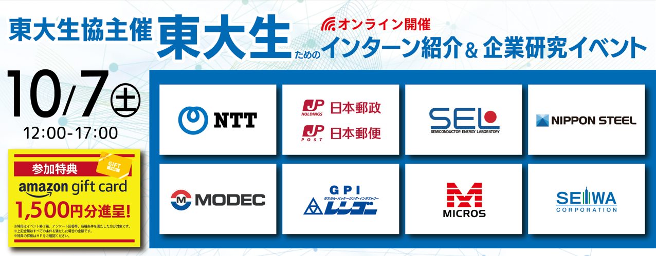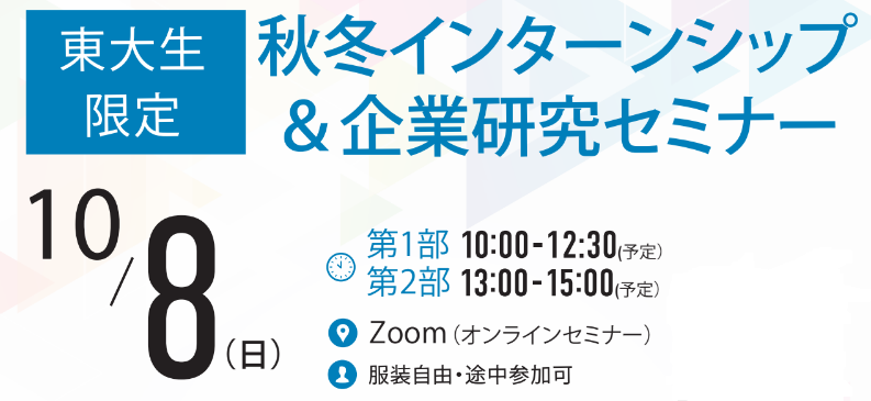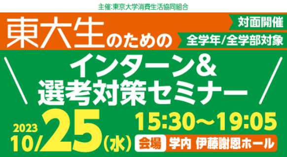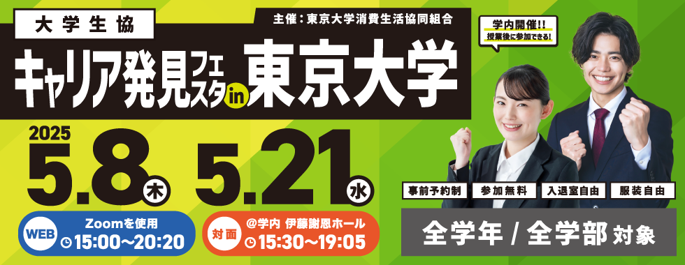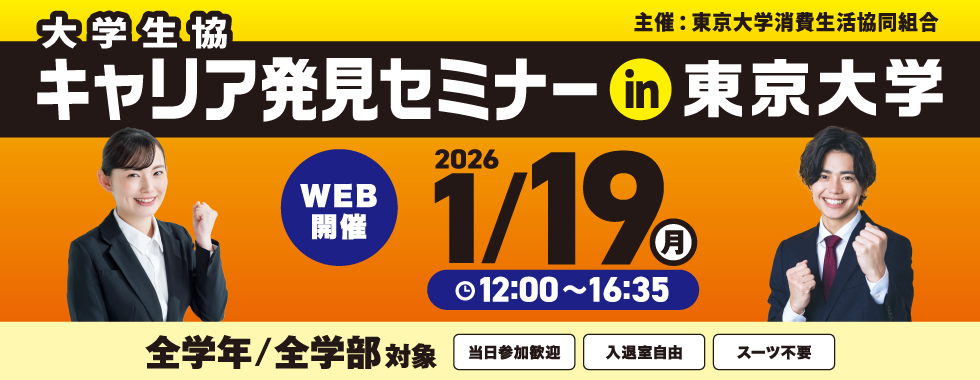 東大生協主催イベント 東大生限定!東大の全学部・全学年対象です 1.「大学生協キャリア発見フェスタ in 東京大学」 日時:1/19(月)12:00-16:35 開催形式:オンライン(Zoom) 運営協力:大学生協UNIVCOOPキャリアナビ 詳細・お申し込み https://career.uc-navi.jp/university/tokyo?utm_source=bp_banner2601 大学生協キャリアナビ 東大生専用ページ https://career.uc-navi.jp/university/tokyo?utm_source=banner2501