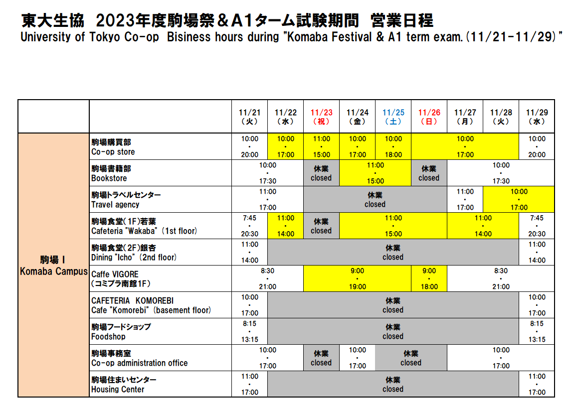 重要なお知らせ 202311/17 駒場祭に伴う営業時間変更のお知らせ(11/21-29) 駒場Ⅰキャンパスは、駒場祭およびA1ターム試験のため、下記の日程で営業時間が変更となります。(黄色部分が変更箇所です) 2023/11/21~11/29 駒場Ⅰキャンパス営業日程(pdf) Tweet お知らせ 一覧へ