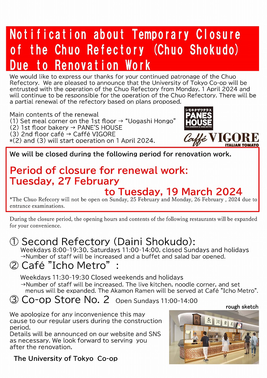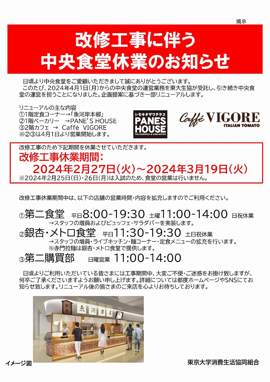 重要なお知らせ 20242/5 全体 改修工事に伴う中央食堂休業のお知らせ 日頃より中央食堂をご愛顧いただきまして誠にありがとうございます。改修工事のため下記期間を休業させていただきます。<改修工事休業期間>2024年2月27日(火)~2024年3月19日(火)※2024年2月25日(日)・26日(月)は入試のため、食堂の営業は行いません。 Tweet お知らせ 一覧へ