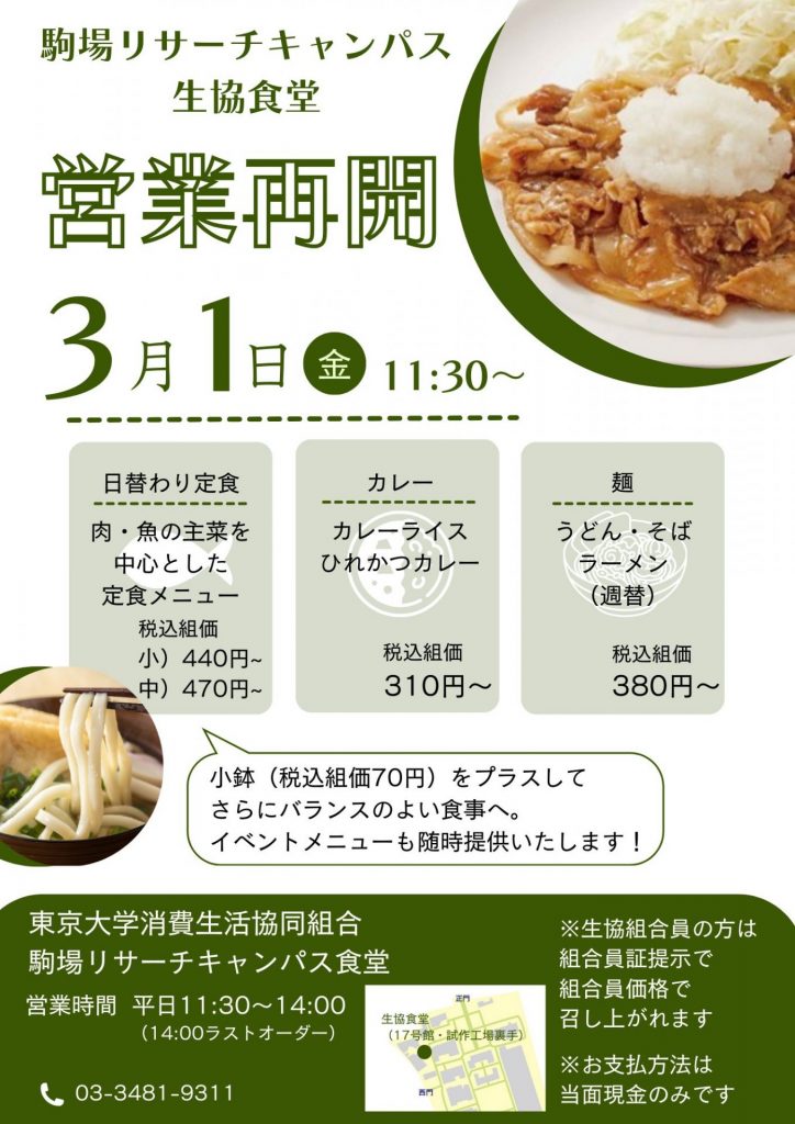 【3月1日より】駒場リサーチキャンパス食堂営業再開のお知らせ