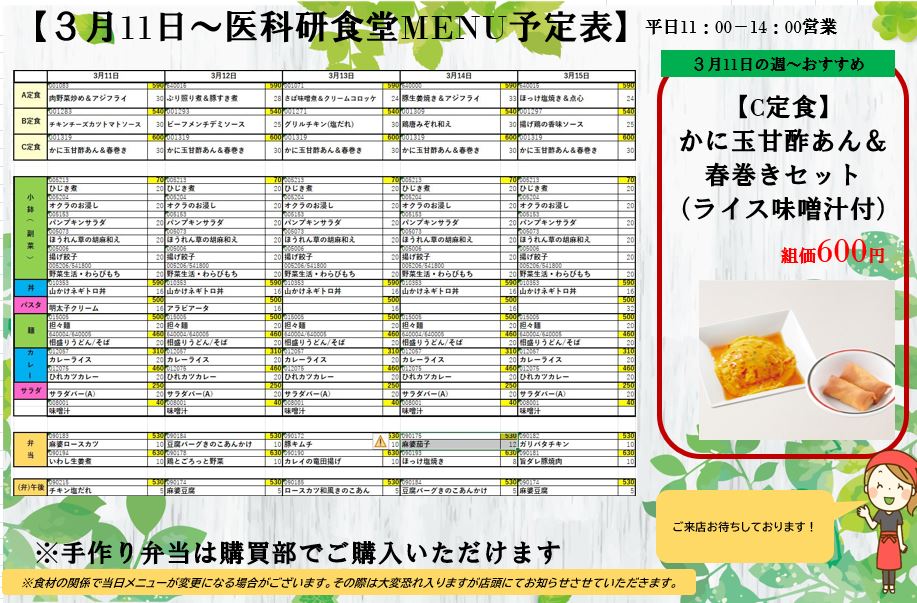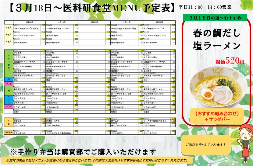 3月11日~22日までの医科研食堂のメニュー予定をお知らせいたします。