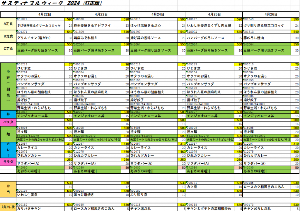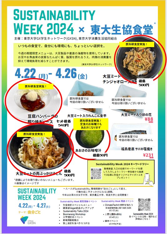●4月22日の週おすすめ…サスティナブルウィーク開催!医科研食堂では豆腐バーグ照り焼きソースをCセットで、大豆ミートチンジャオロース丼、大豆ミート肉ぶっかけうどん/そばなど提供いたします!また、定食、単品全てのお味噌汁が「あおさのお味噌汁」でのご提供です。