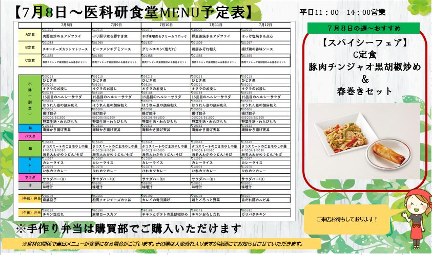 ●7月8日の週おすすめ「スパイシーフェア①:豚肉チンジャオ黒胡椒炒め&春巻きセット」(C定食)