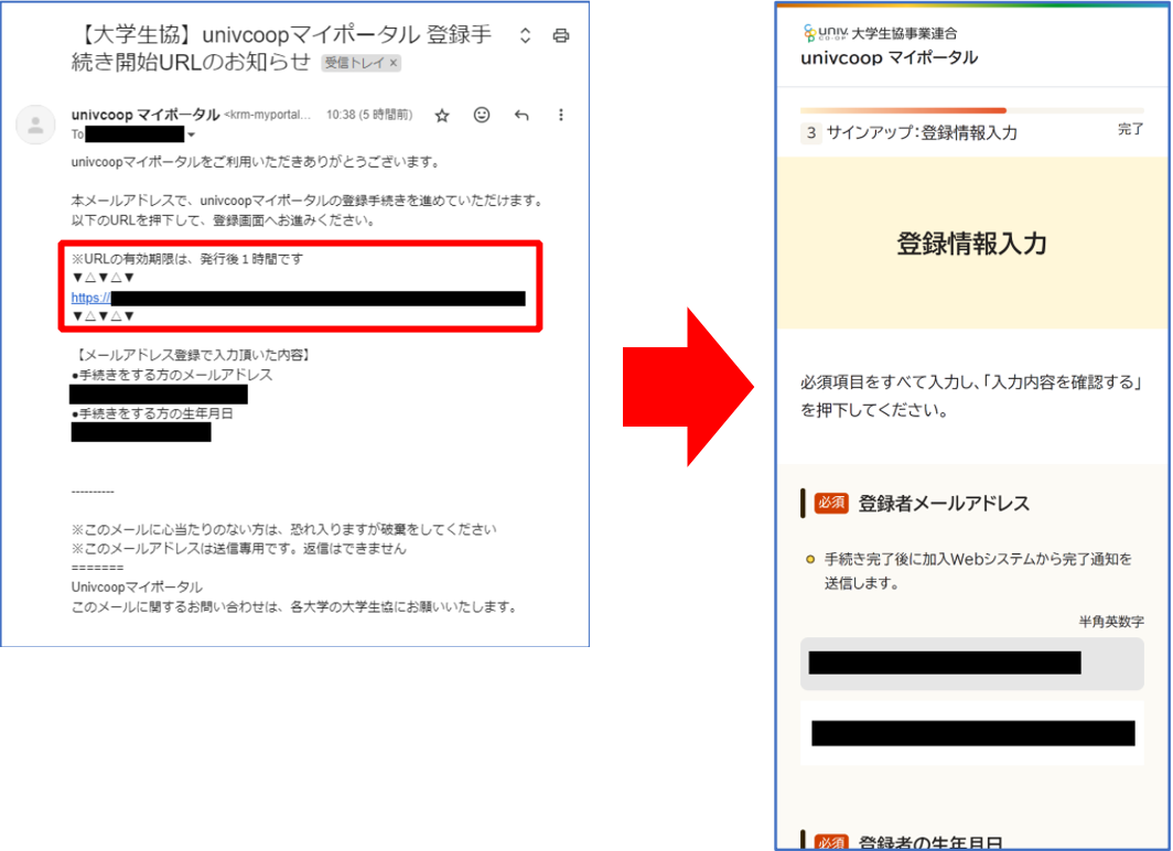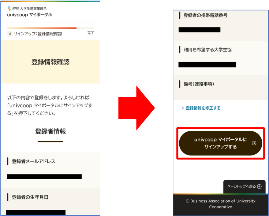 ④入力後、内容を確認し、「univcoopマイポータルにサインアップする」を押してください。