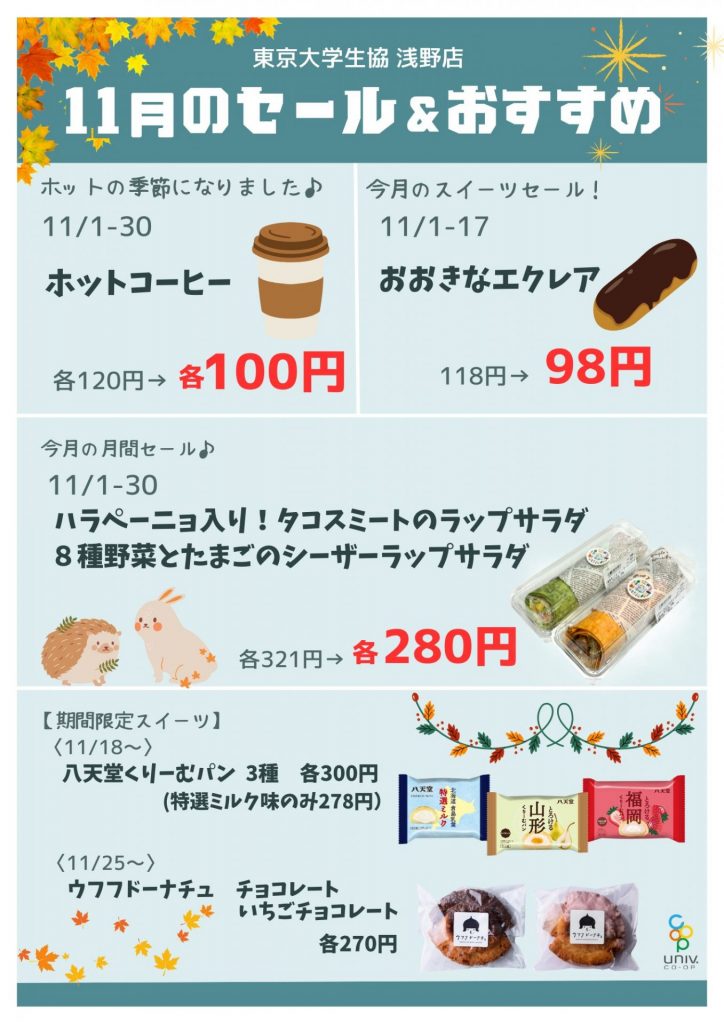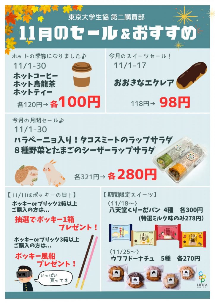 お知らせ 202410/26 本郷(浅野弥生) 【本郷/浅野】11月のお弁当ラインナップ 本郷第二購買部・浅野店・赤門店の11月のお弁当のラインナップ・月間ポスターです。 仕出し山喜弁当(620円)メニュー表ダウンロード 管理管理栄養士監修弁当 華一(600円)メニュー表ダウンロード Tweet お知らせ 一覧へ