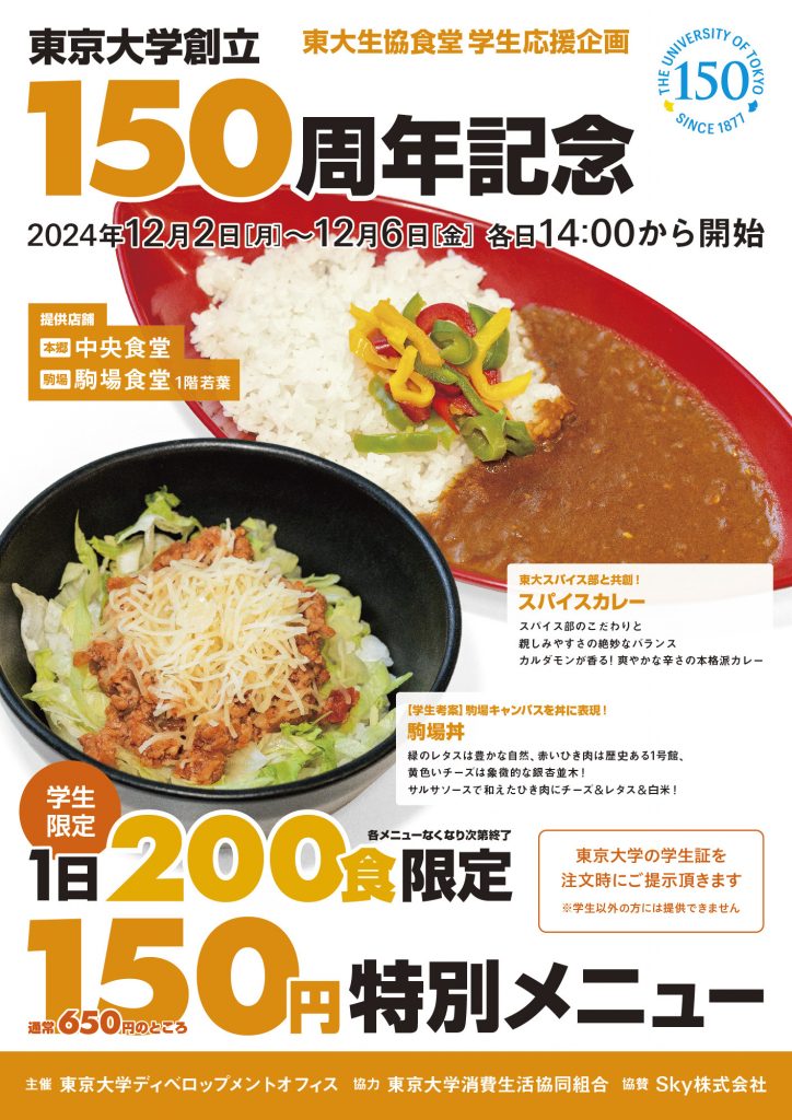 重要なお知らせ 202412/2 東京大学創立150周年 東大生協食堂 学生応援企画 12月2日(月)~12月6日(金) 各日14:00~ 無くなり次第 2種類の特別メニューを、1日200食限定で、150円にて提供!東大生のみが購入できるメニューとなります(一般利用不可)※東大の学生証を注文時に提示していただきます Tweet お知らせ 一覧へ