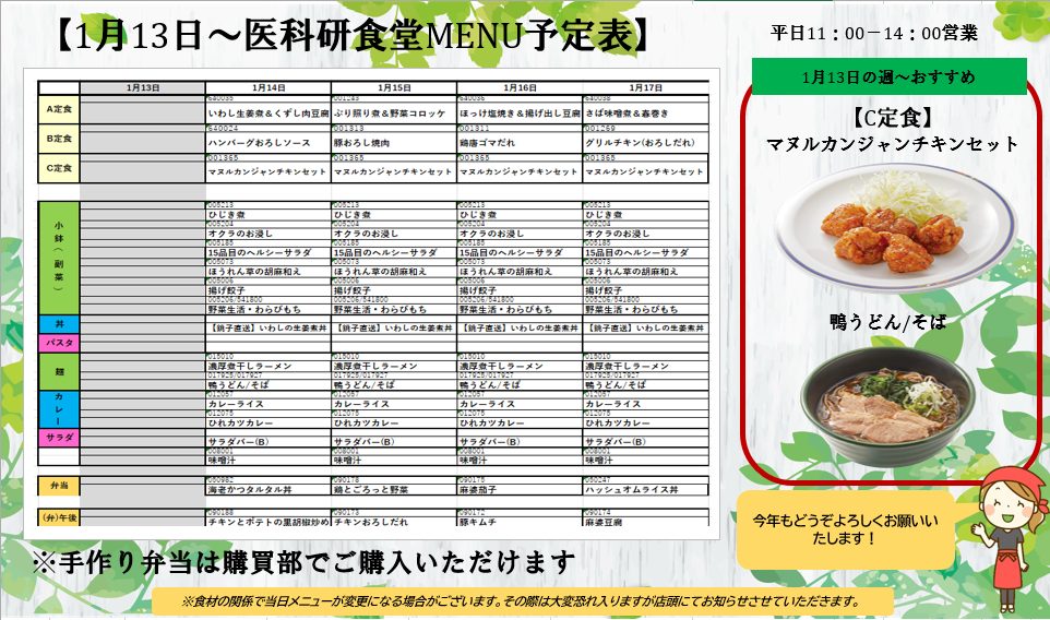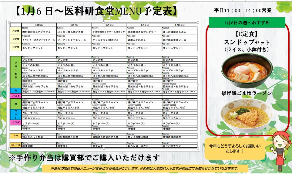医科研食堂・購買1/6~1/17メニュー予定お知らせ
