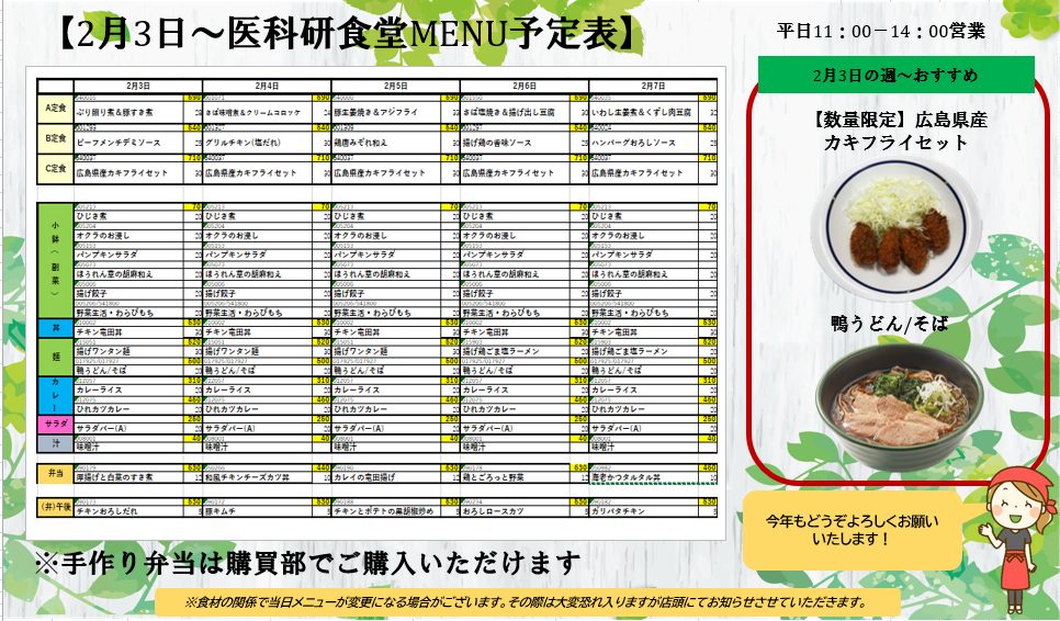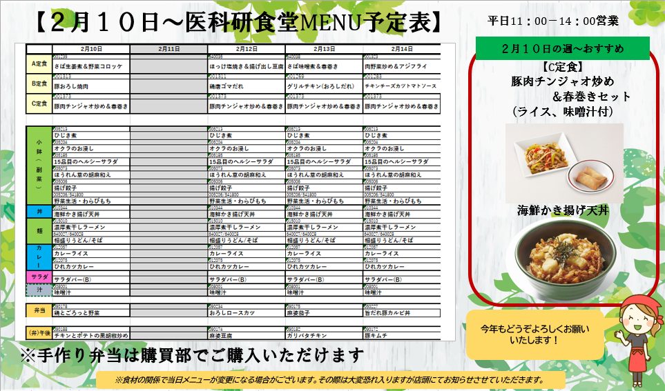 医科研食堂2/3~14メニュー予定&医科研購買2月お弁当予定お知らせ
