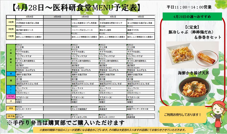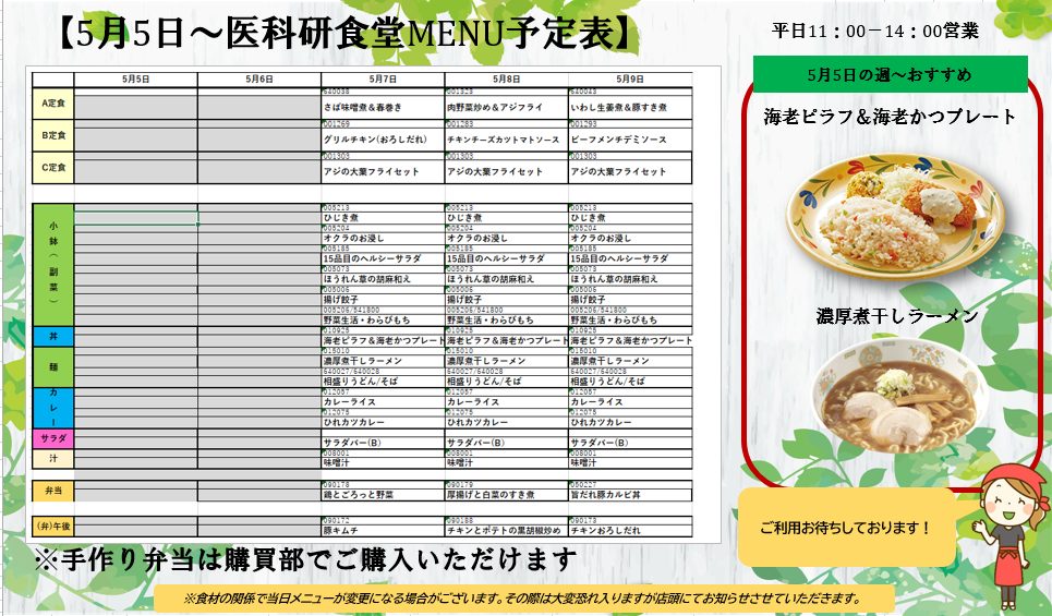 お知らせ 20254/23 医科研 医科研食堂4/28~5/9メニュー予定&購買はないち弁当5月予定表 いつも医科研食堂・購買をご利用いただきありがとうございます。 4月28日~2週間の食堂メニュー予定をお知らせいたします 4月29日、5月3日~6日は医科研食堂・購買ともに祝日休業となります。 ●4月28日の週おすすめ…C定食:豚冷しゃぶ(棒棒鶏だれ)春巻きセット ●5月5日の週おすすめ…海老ピラフ&海老かつプレート ●5月はないち弁当(購買にて販売の仕出し弁当)のメニュー予定は以下となります ※土曜日は店舗休業の為販売はございません。 e1c84a55d92015d7e409b66327a73b2aダウンロード ご来店お待ちしております! Tweet お知らせ 一覧へ