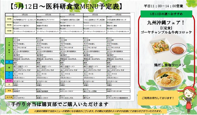5月12日~2週間の医科研食堂・購買のメニュー予定をお知らせいたします。