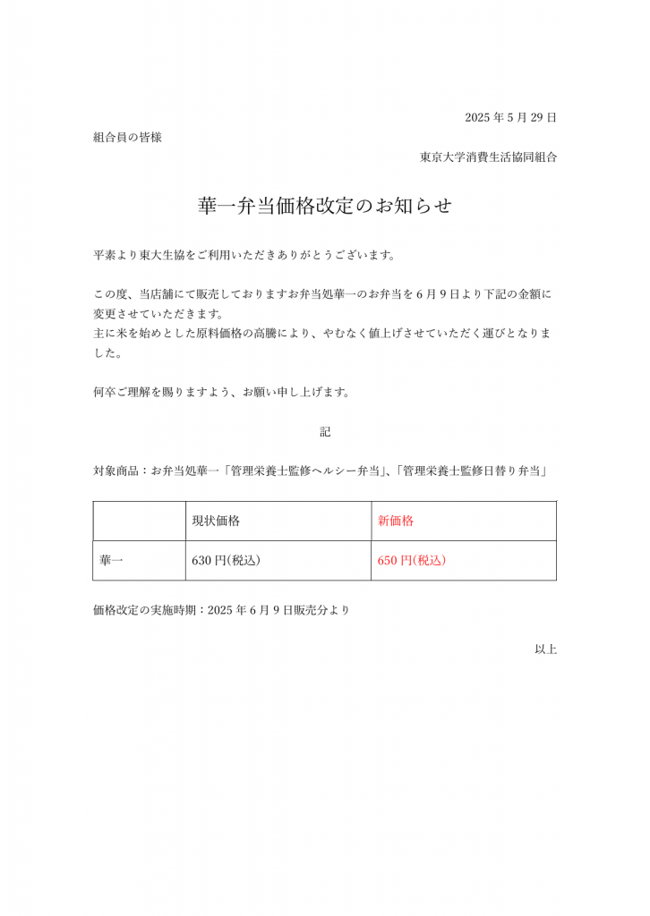 6/9(月)より華一弁当の価格改定がございます。詳細は下記お知らせをご覧ください。