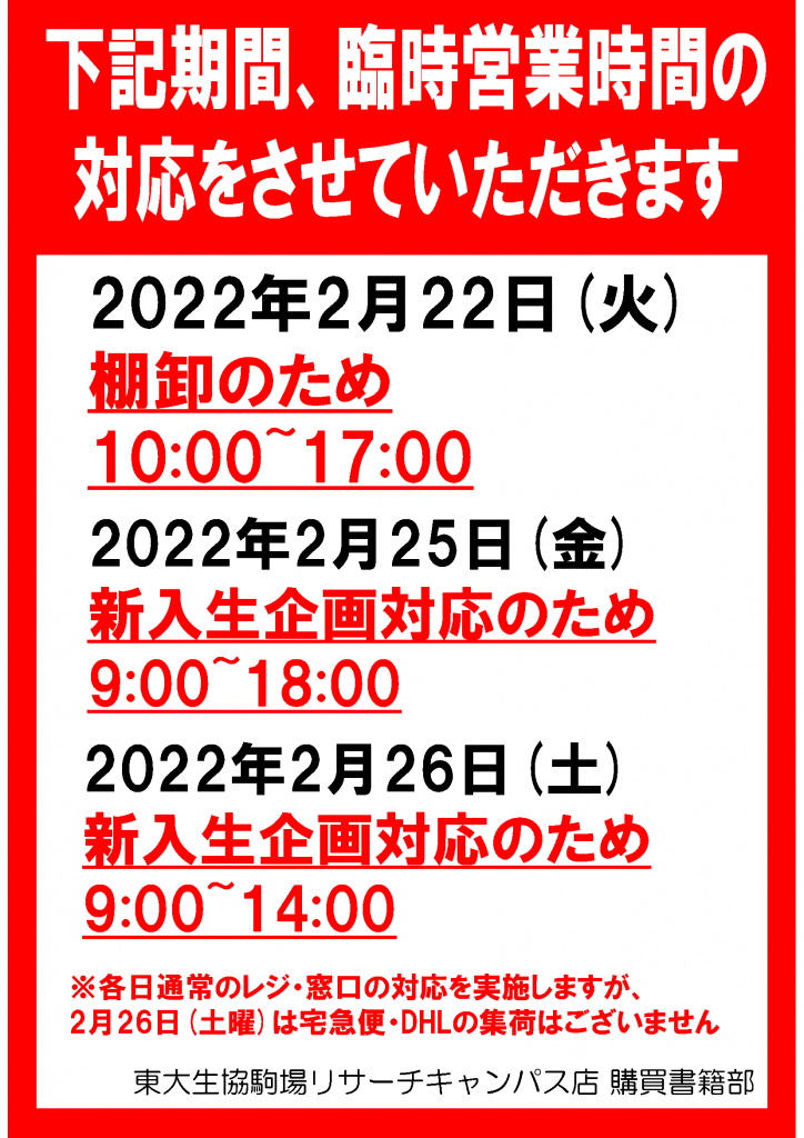 2/22 , 2/25 , 2/26 駒場リサーチキャンパス店 臨時営業変更のお知らせ