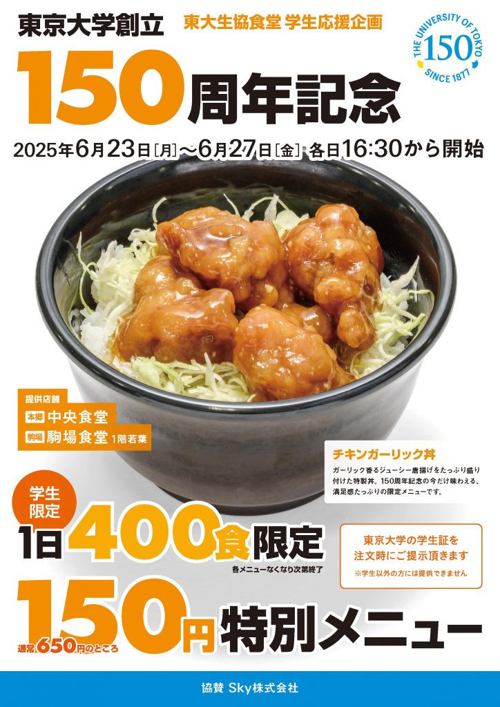 お知らせ 20256/16 東京大学創立150周年記念企画 6/23(月)〜6/27(金)中央食堂、駒場食堂にて一日400食堂限定でチキンガーリック丼を150円で販売いたします。 Tweet お知らせ 一覧へ
