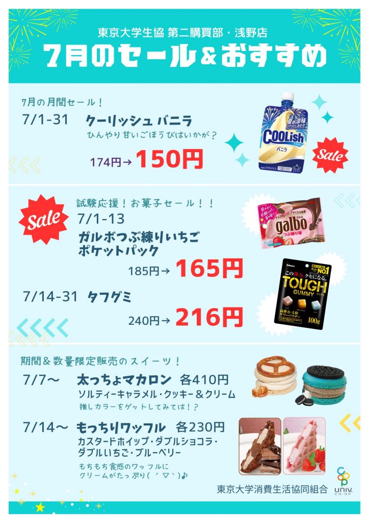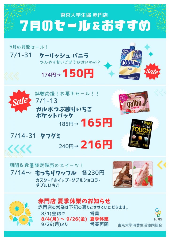 本郷第二購買部・浅野店・赤門店の7月のお弁当ラインナップ・月間ポスターです。