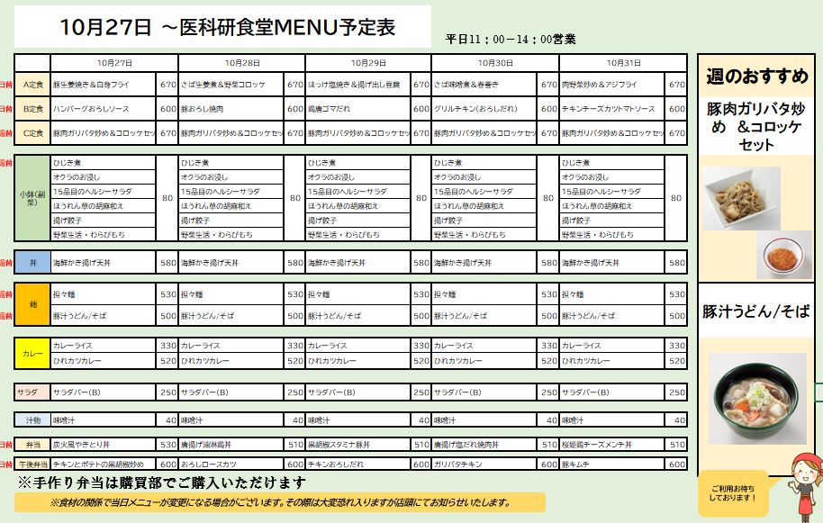 ●10月17日~医科研食堂おすすめ: 【C定食】豚肉ガリバタ炒め&コロッケセット 【麺】豚汁うどん/そば