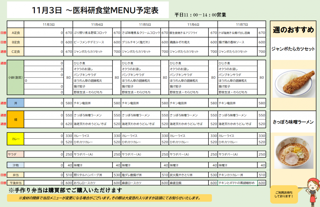 ●11月3日~医科研食堂おすすめ: 【C定食】ジャンボたらカツセット 【麺】さっぽろ味噌ラーメン