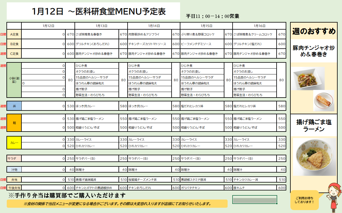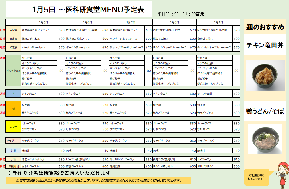 お知らせ 202512/25 医科研 医科研食堂1/5~1/16メニュー予定 いつも医科研食堂j・購買をご利用いただきましてありがとうございます。 ●1月5日~医科研食堂おすすめ: 【丼】チキン竜田丼 【麺】鴨うどん/そば ●1月13日~医科研食堂おすすめ: 【C定食】豚肉チンジャオ炒め&春巻きセット 【麺】揚げ鶏ごま塩ラーメン また、ご好評の華一日替わり仕出し弁当も購買にてご用意しております。(平日毎日2種:土曜は店舗休業の為、提供はございません) ご利用のほどお待ちしております!! Tweet お知らせ 一覧へ