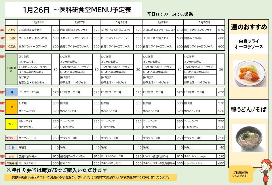●1月26日~医科研食堂おすすめ: 【C定食】白身フライオーロラソース 【麺】鴨うどん/そば