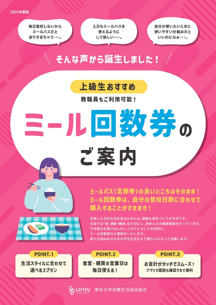 忙しい上級生でも、値段を気にせず毎日しっかり食事をとるためのシステムです。ご自身の生活スタイルに合わせて3プランからお選びいただけます。駒場キャンパス、本郷キャンパスのどちらでもご利用いただけます。