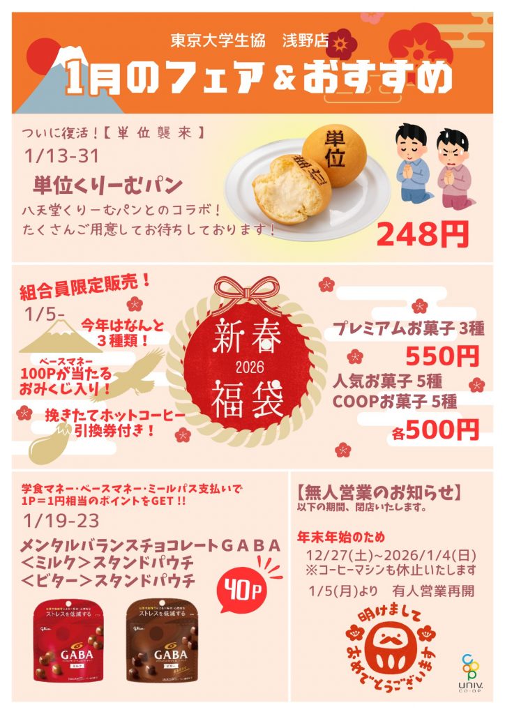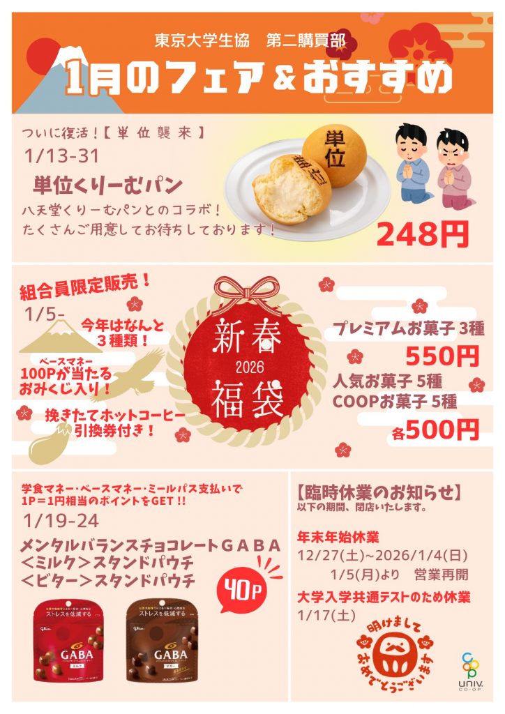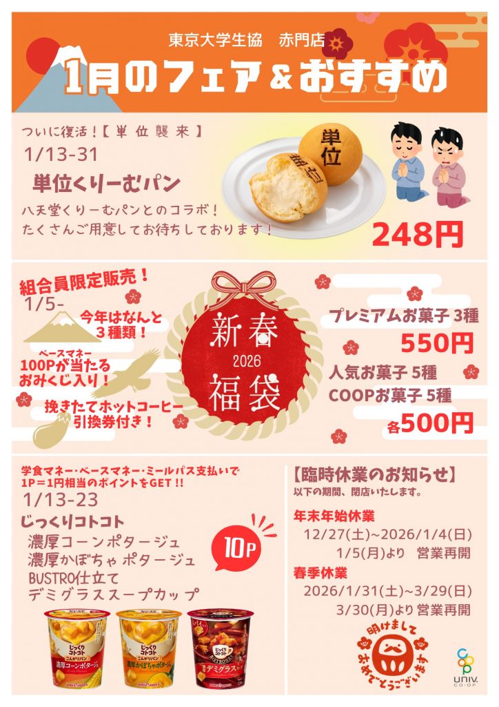 本郷第二購買部・浅野店・赤門店の1月のお弁当ラインナップ・月間ポスターです。