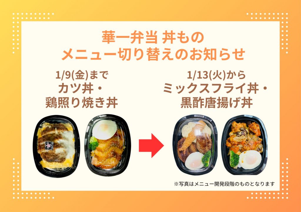1/13(火)より、華一弁当の丼もの(690円) のメニューが 下掲の画像の通り カツ丼・鶏照り焼き丼 から、ミックスフライ丼・黒酢唐揚げ丼に変更となります。 ぜひご利用ください!