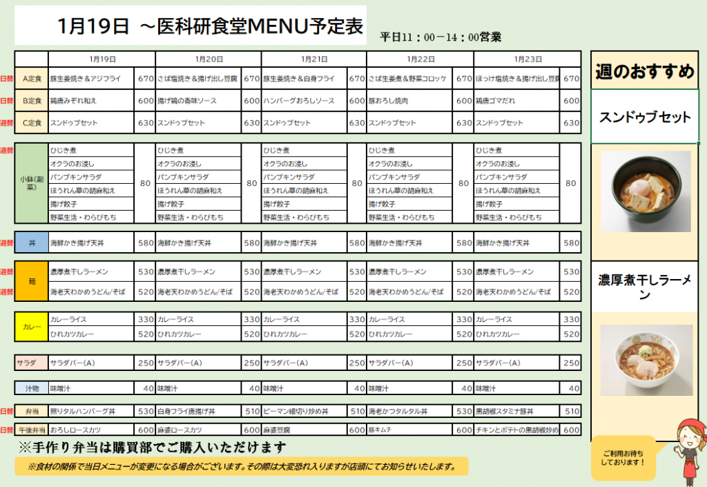 医科研 医科研食堂1/19~1/30メニュー予定&購買部華一弁当予定表